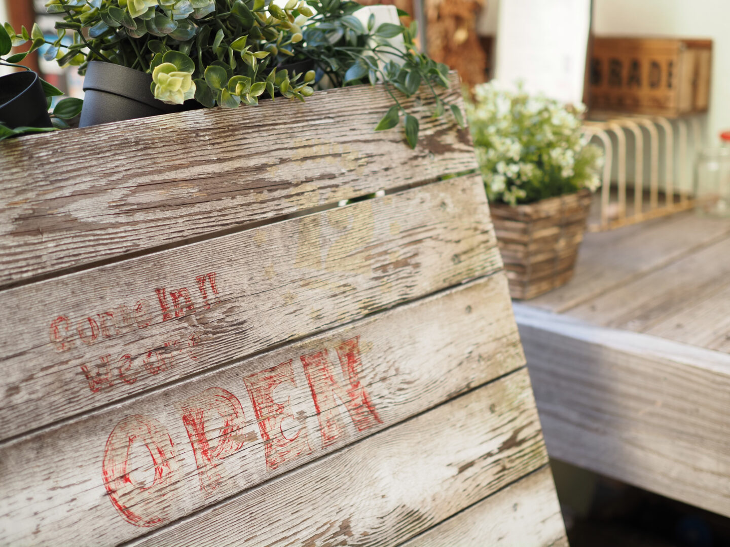 神戸の路地裏をスナップ。店先の奥行きがない場面で可愛らしい木の看板にぐっと寄って撮影、看板の面積を大きくすることで主役をはっきりさせました。尚、日本語のものが入らないようにすることで外国っぽい印象となります。