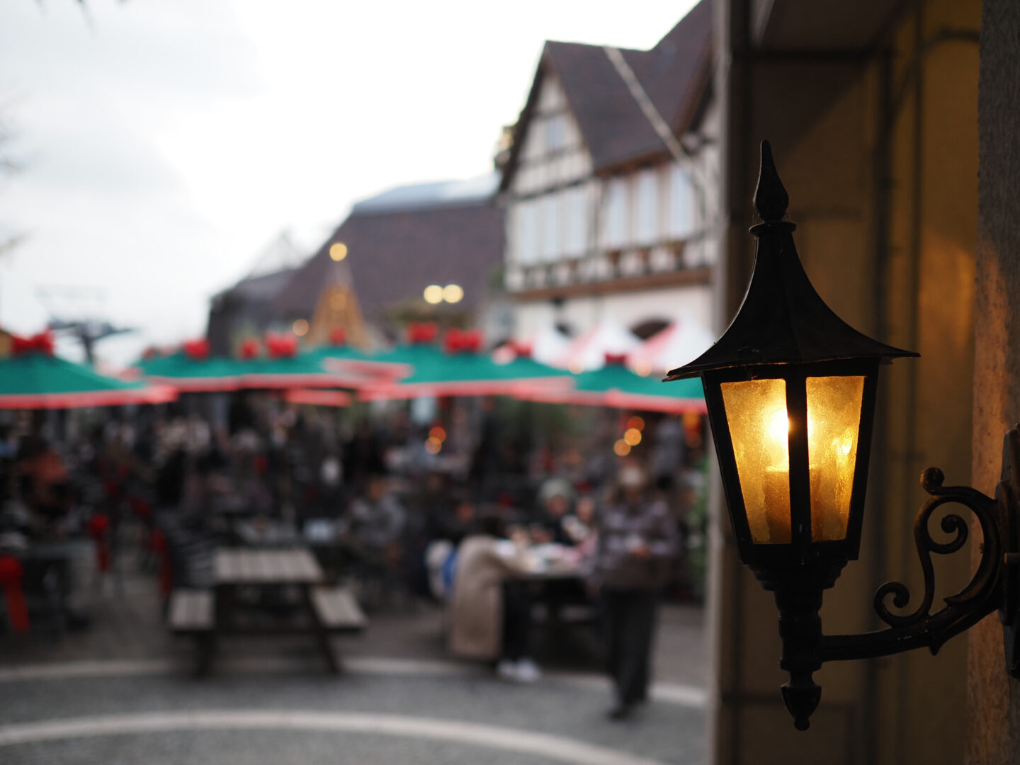 多くの人で賑わうクリスマスマーケットで、背景の人混みをできるだけボカすべく絞りは開放で撮影。灯り始めた明かりが画面中央付近では、ほぼまぁるい玉ボケとなっています。