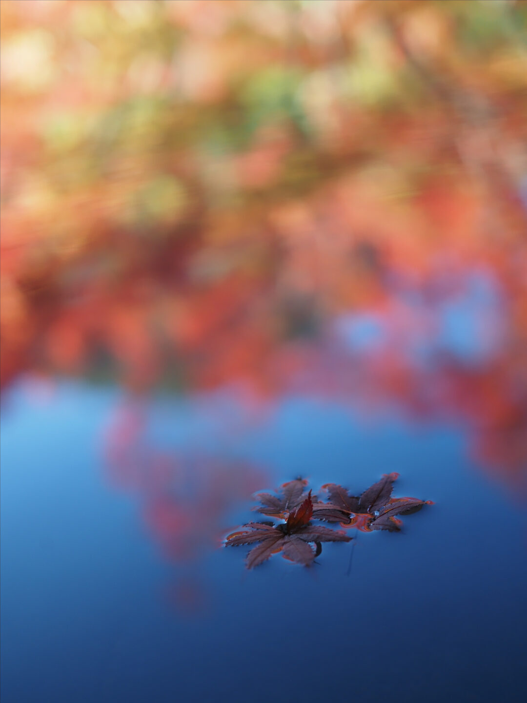 水に浮かんだモミジの葉にできるだけレンズを寄せ、水に映る紅葉を背景に撮影。水面の映り込みは大きくボケていますが、水面のゆらぎも感じられます。全体的に大きなボケの中でピントの合ったモミジの葉が浮かび上がるとともに、水面の映り込みはそのゆらぎの効果もあって赤やオレンジ、緑の絵の具で描いた水彩画のような表現となりました。