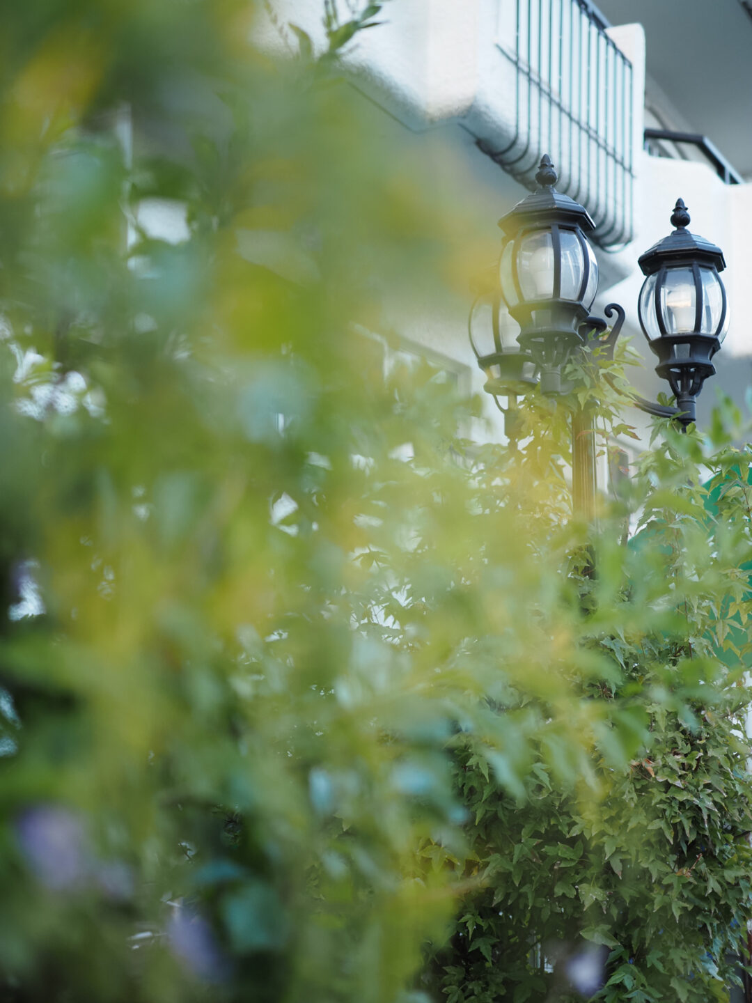 歩道の植栽越しの街灯にピントを合わせることで手前の葉と花を前ボケに。前ボケは、ぼかしたい対象物をレンズの前にできるだけ近づけることでより大きなボケとなります。