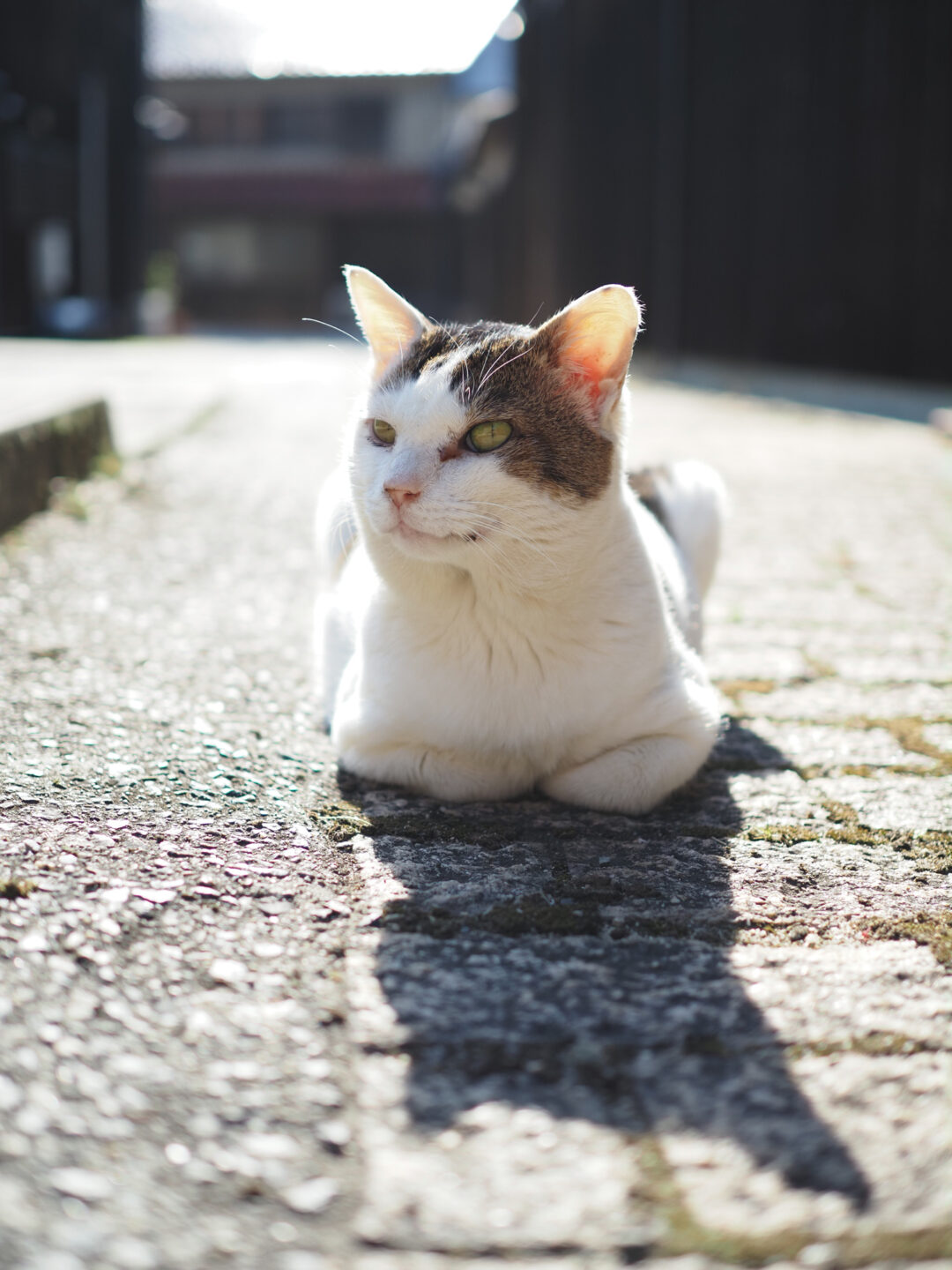 レトロな町の路地で出会った猫。首輪はないものの、人に慣れているのかとてもフレンドリーで近付かせてくれました。背景の建物は様相がわかる程度のボケ感です。