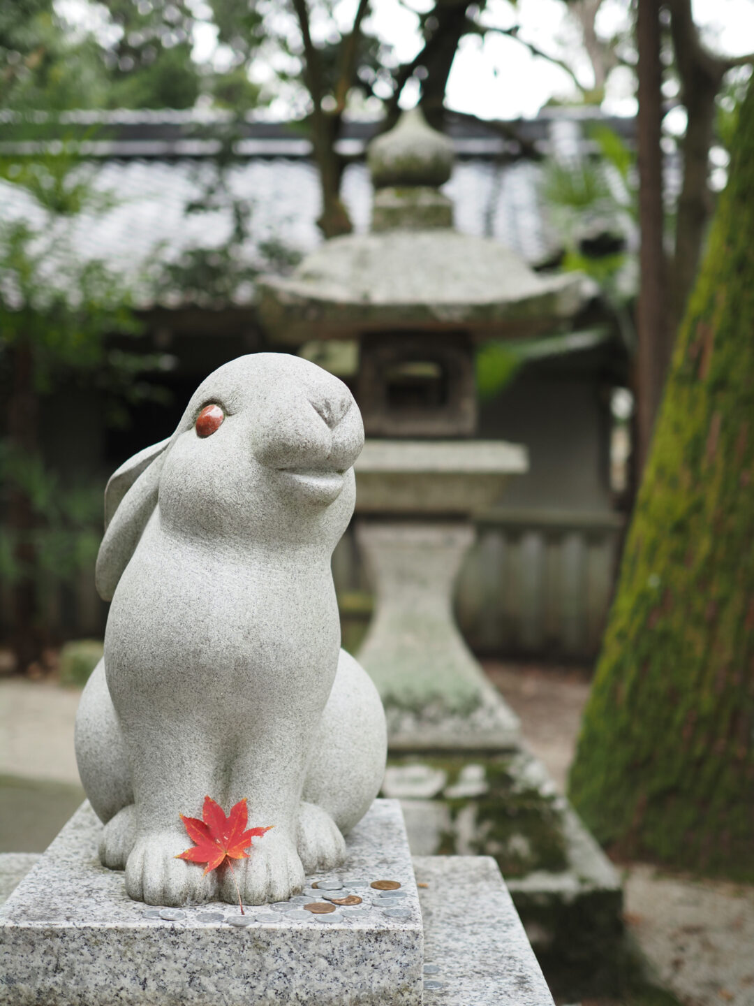 紅葉シーズンはとっくに過ぎていたものの、足元にモミジの葉を一枚のせたうさぎさんと背後に灯籠が入るようにフレーミング。この構図で撮るためには、うさぎさんから少し離れることになり、この距離だと背景はさほど大きくボケている印象とはなっていません。また遠方の玉ボケも小さなものとなっています。