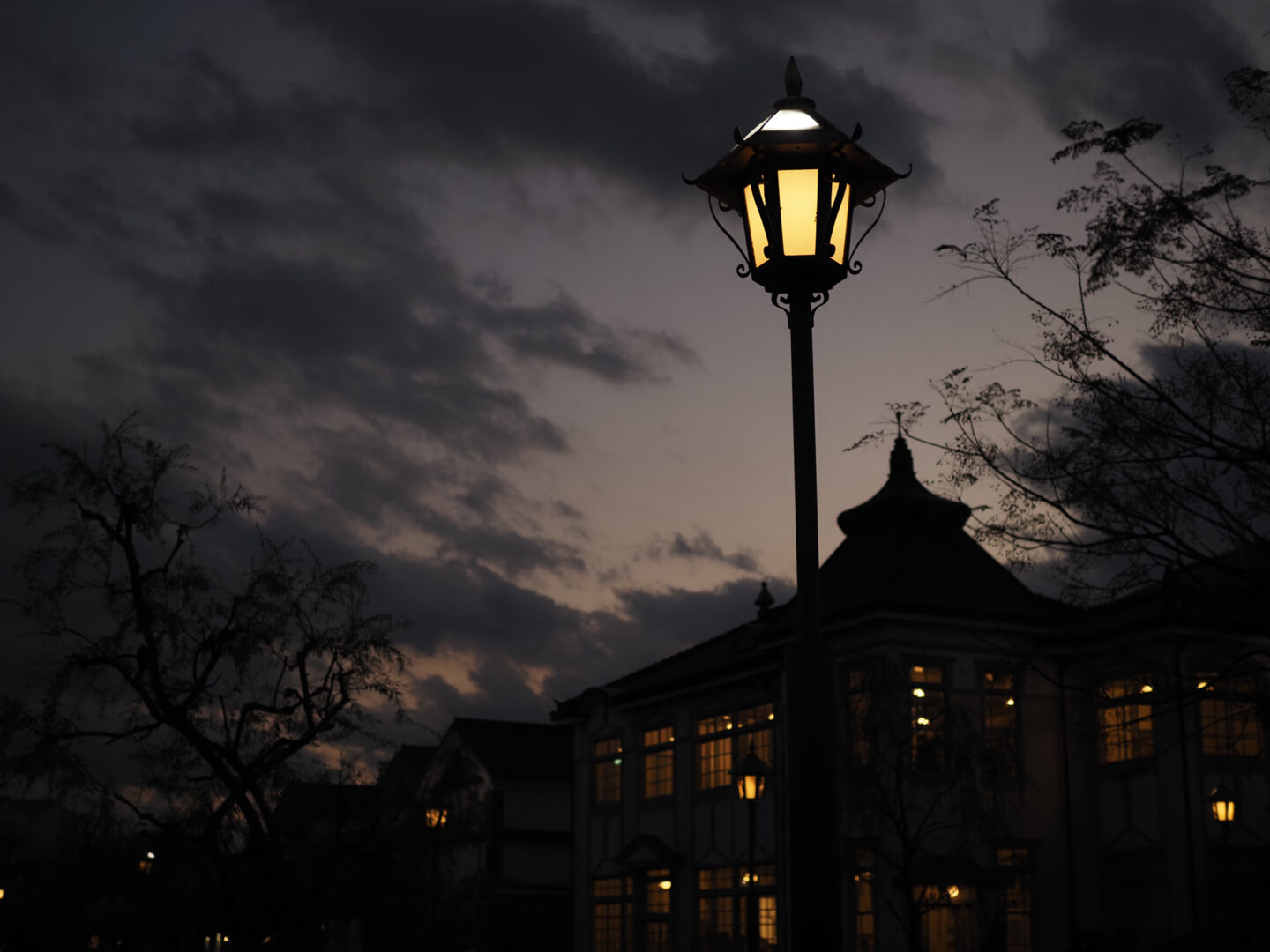 異人館で有名な神戸・北野の夕暮れ時。ガス灯を模した街灯と狭い車道を隔てた教会の尖塔を組み合わせました。ピントは手前の街灯に合わせ、後ろの教会が大きくボケないように絞りをF5.6に設定。背景が空のみ故に奥行きを感じさせない1枚となりました。