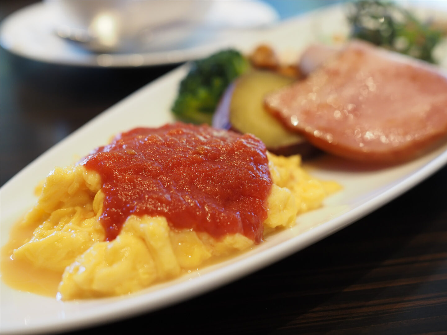 ホテルの朝食のスクランブルエッグを着座のまま撮影。極端にボカしたいわけではなかったため、被写界深度を確認しながら絞りはF2.8で落ち着きました。