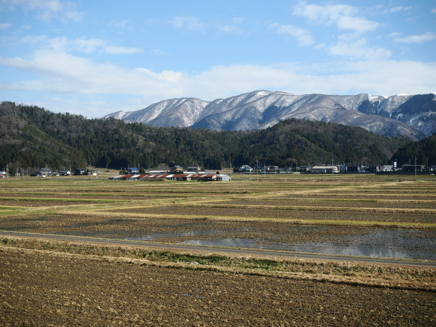 本格的な寒波が来る前の北陸地方を走る電車の窓越しに撮影しました。広すぎず、狭すぎない画角に雪を被った山並みと冬の田園風景(水面にはその山々が映り込んでいることもわかります)が自然な遠近感で表現されています。