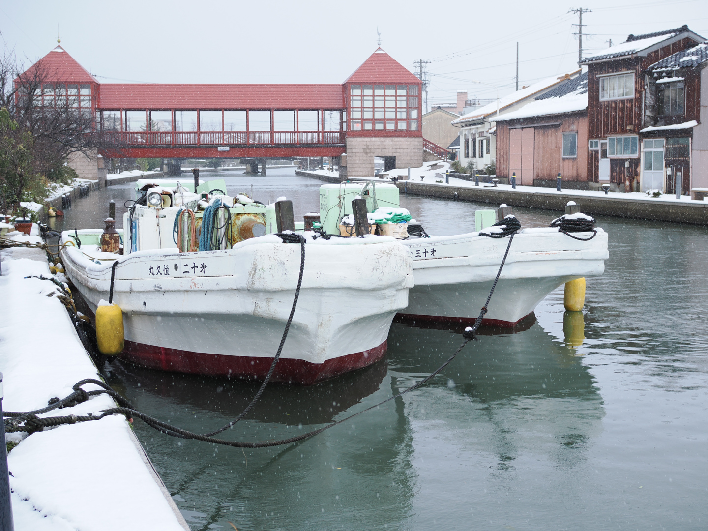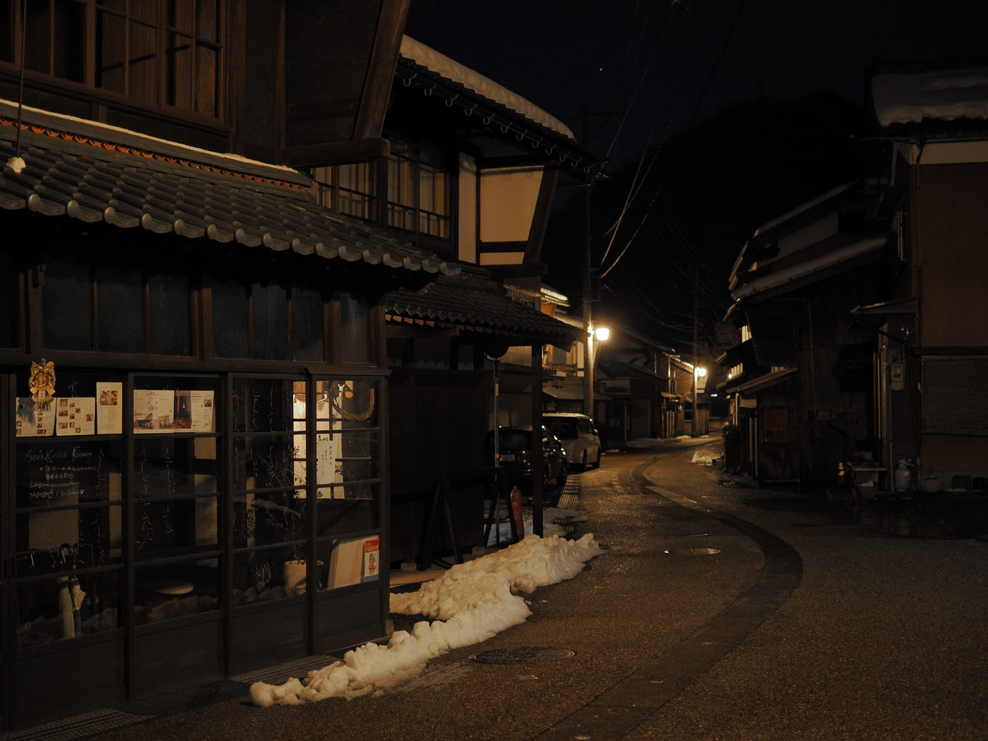 雪の旧街道を撮りたくて訪ねたものの、思ったほど雪がなかった……(残念!)という場面ですが、せっかく来たので暗くなるまで散策してみました。街灯が少なめでかなり暗い環境だったのですが、F1.8とカメラの手ブレ補正機能が優秀であるお陰で手持ちでの撮影ができました。
