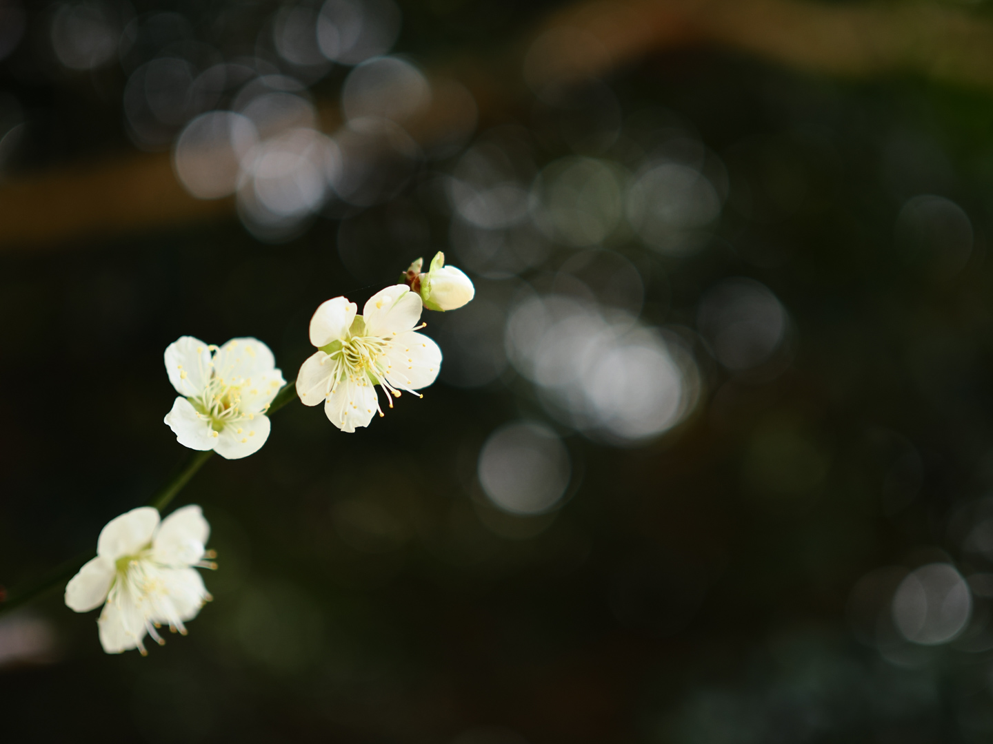 満開手前の枝垂れ梅を、下から見上げる角度で撮影しました。まだ蕾も多いことから、これより広角だとお花のボリューム感が出ず、望遠になると画角が狭くなる、その中間のちょうど良い塩梅のスケール感に収まったかと思います。