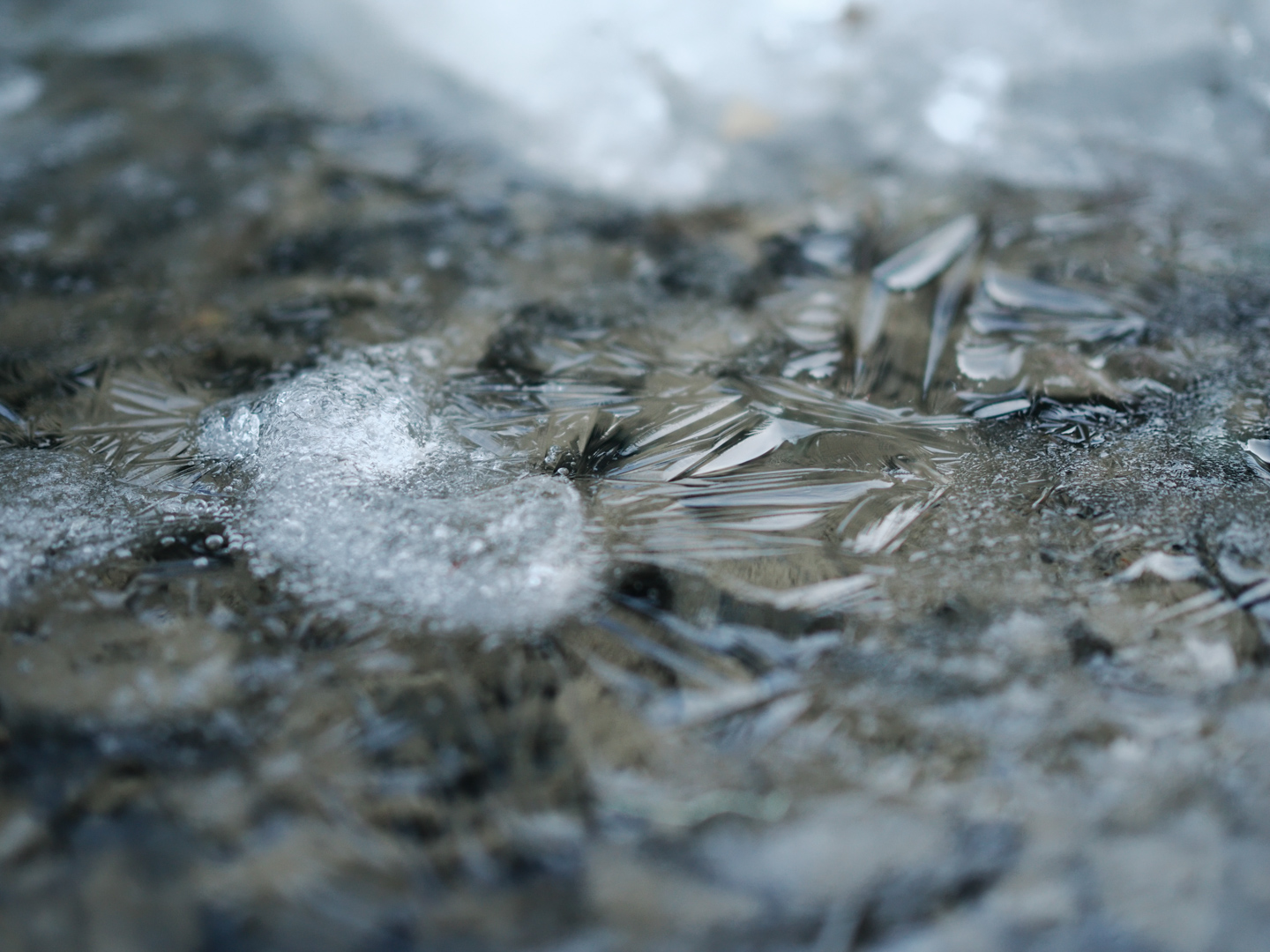凍結した路面の氷が綺麗で思わずしゃがみ込んで撮影、マクロレンズではないものの氷の表面の質感が十分伝わる一枚を撮ることができました。