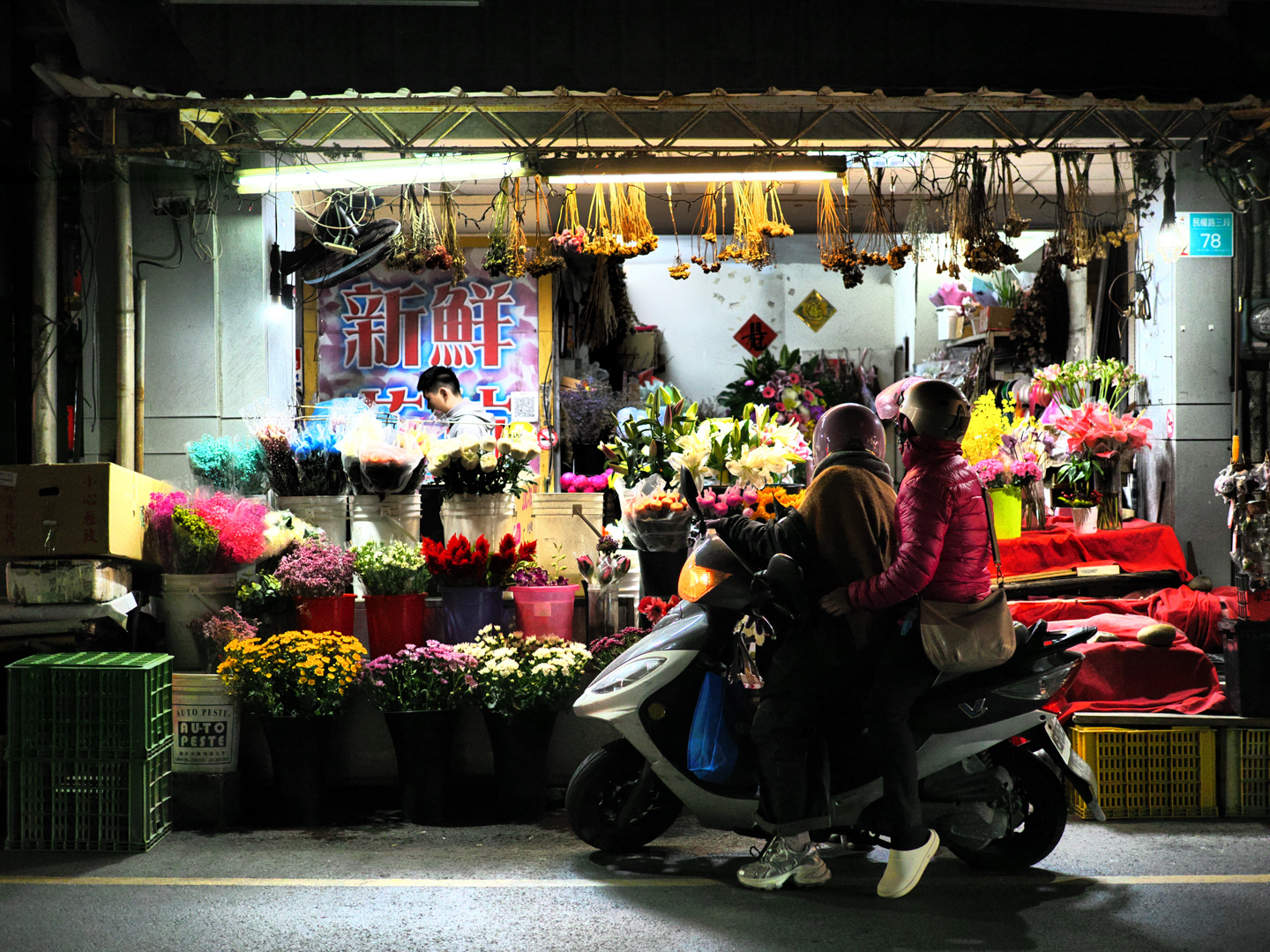 すっかり暗くなった中で開いていた花屋さんでの一コマ。2車線の道路の反対側から撮影しているのですが、小さな間口の店舗の全景とバイクの二人の大きさとのバランスがピッタリ収まりました。