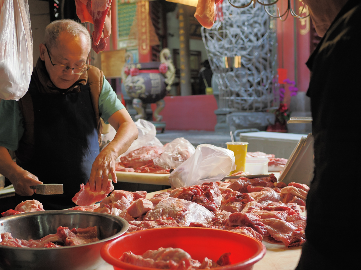 市場で肉屋のおじさんの手元にピントを合わせてお肉を叩いている場面を、お肉を買いに来られたお客さんを手前に入れて地元の日常風景の一コマとして撮影しました。