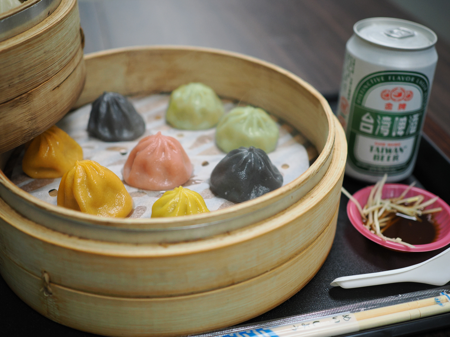 台湾に来たからには食べたい小籠包ですが、残念ながら台南ではほとんど見かけません。台中に到着して、宿近くに小籠包のお店を見つけて喜び勇んで出かけました。お店の人に勧められるままに注文したところ、2段目にカラフルな小籠包がずらり!左手で熱々の蒸篭をずらしつつ右手でカメラを持っての撮影はなかなかに至難の業でしたが、カメラもレンズも小型軽量でとても助かりました。