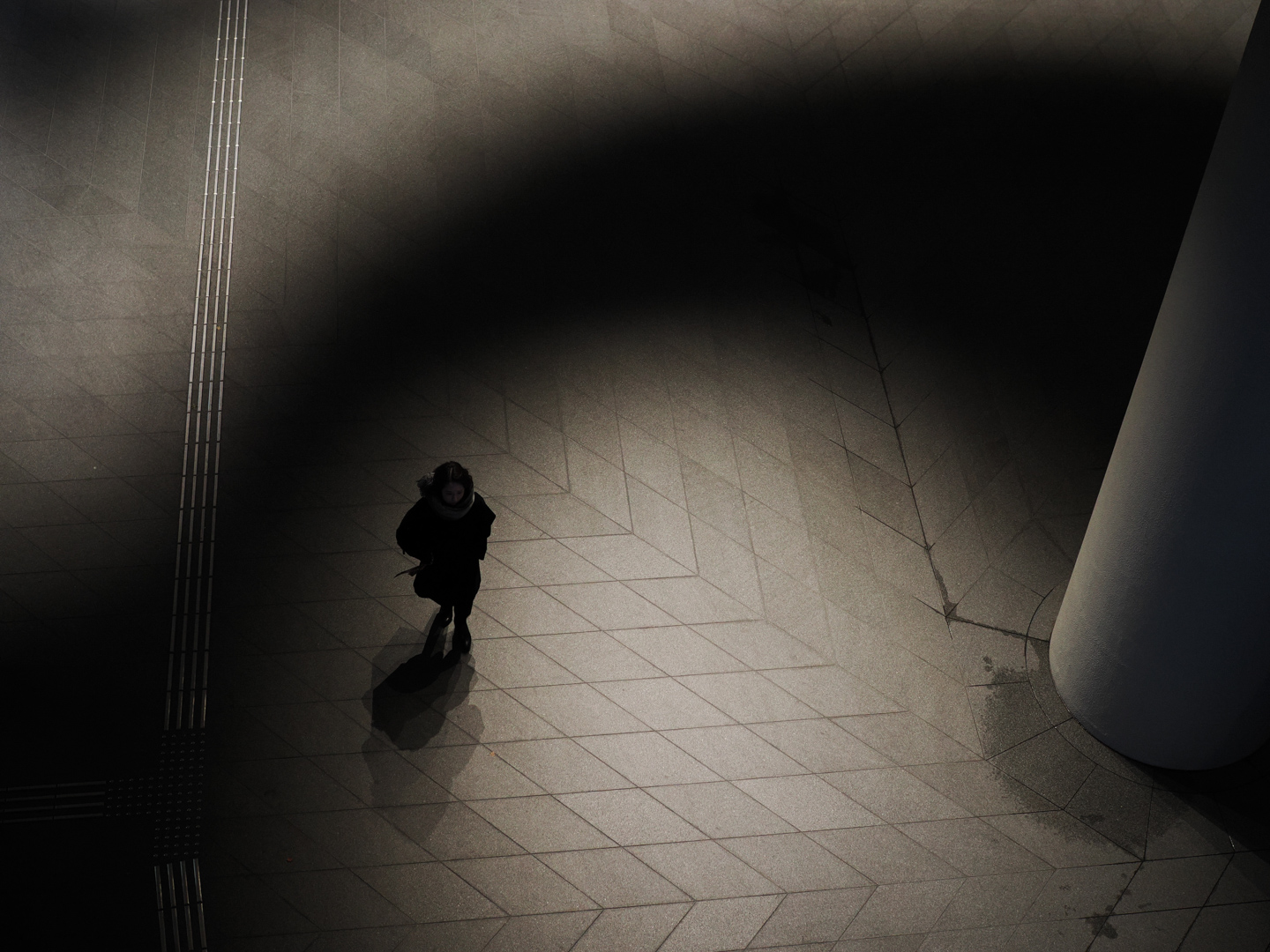 大阪駅近くでフォトジェニックな場所を発見。光の入り具合から造形的な面白さを意識した構図を取りつつ、人物が入るタイミングを見計らって撮影しました。