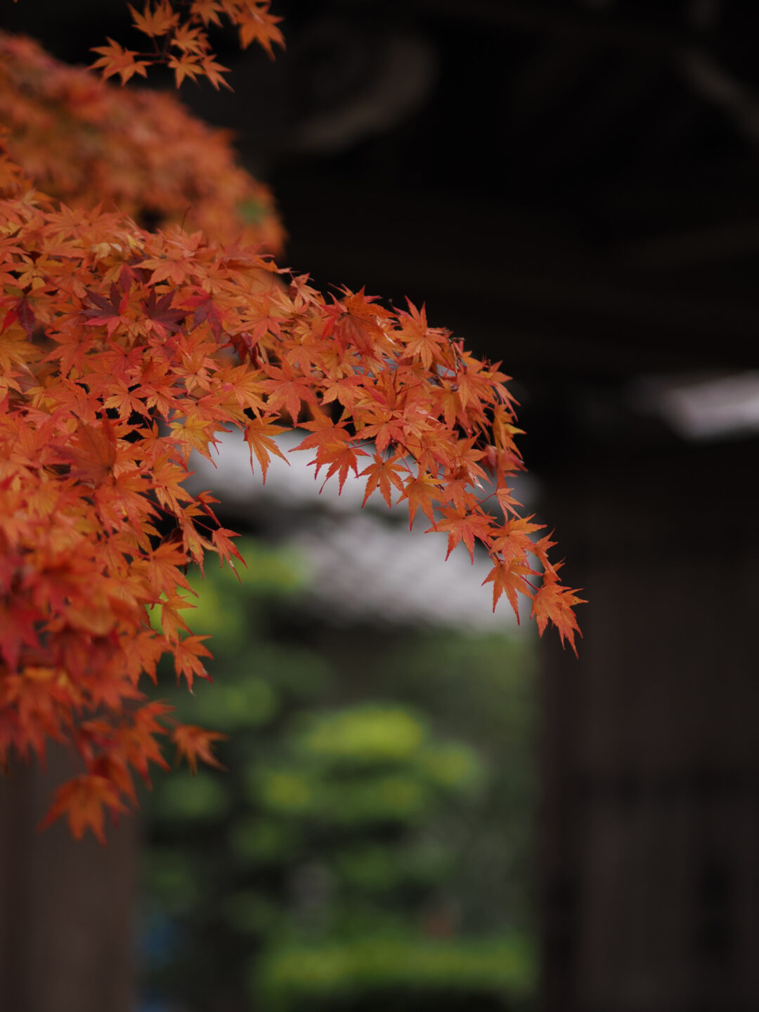少し距離のある紅葉を選んで撮影。お寺の山門の焦茶と、奥の緑の大きなボケがオレンジ色の紅葉を引き立ててくれています。また明るいグレーの屋根瓦が、距離があるために小さなボケとなっていますが、規則正しくきれいに並んでいることがわかります。