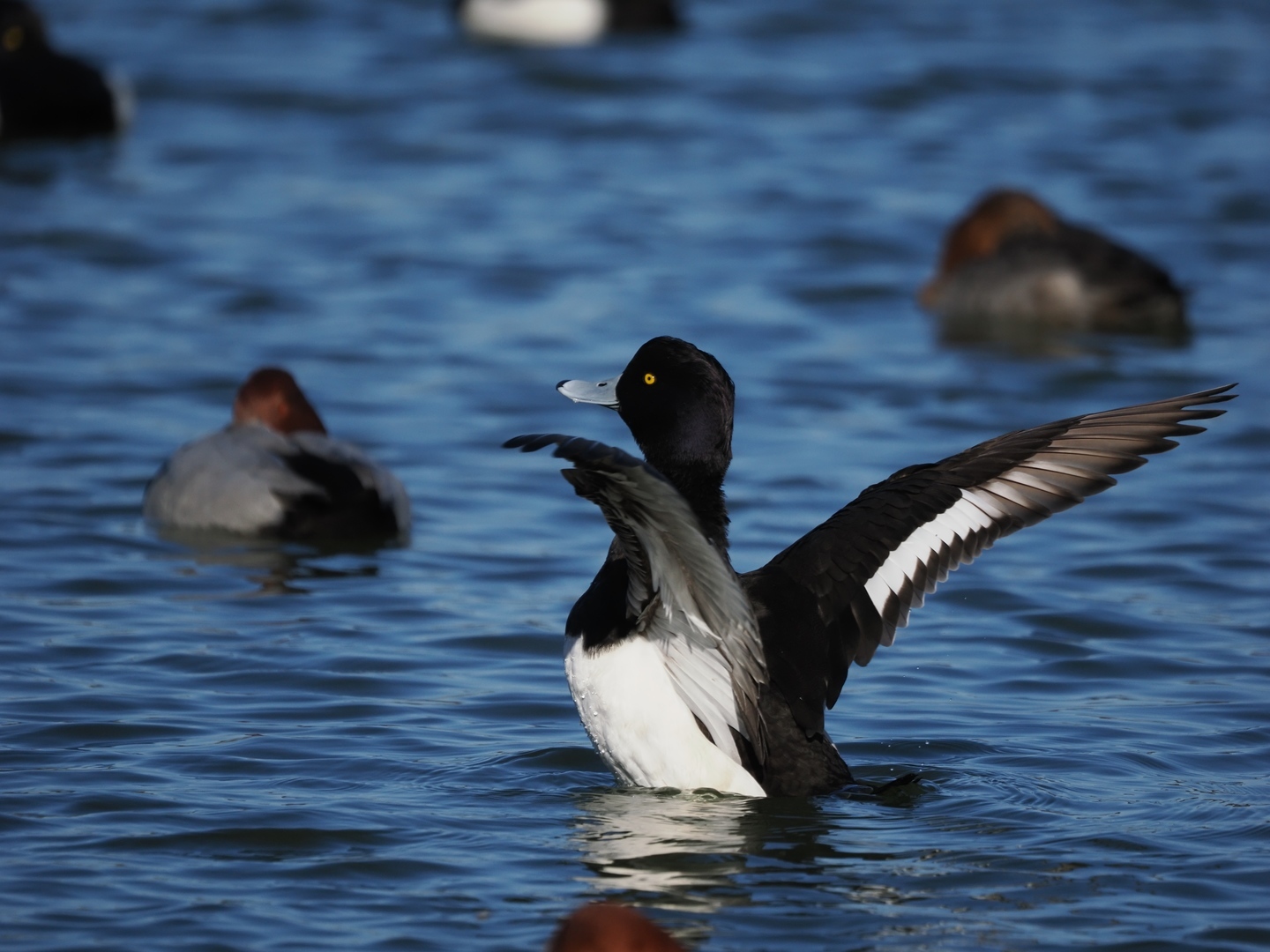 OM-1と本レンズの組み合わせで、AI被写体認識AF(鳥)を使用して撮影したもの。それまで泳いでいたキンクロハジロが、おもむろに起き上がり、羽を広げた。従来のグループターゲットを使用した撮影では、手前にある翼に合焦しやすい場面だが、AI被写体認識AF(鳥)を使えば、カメラが鳥の「瞳」を見つけ、追いかけてくれるので安心だ。