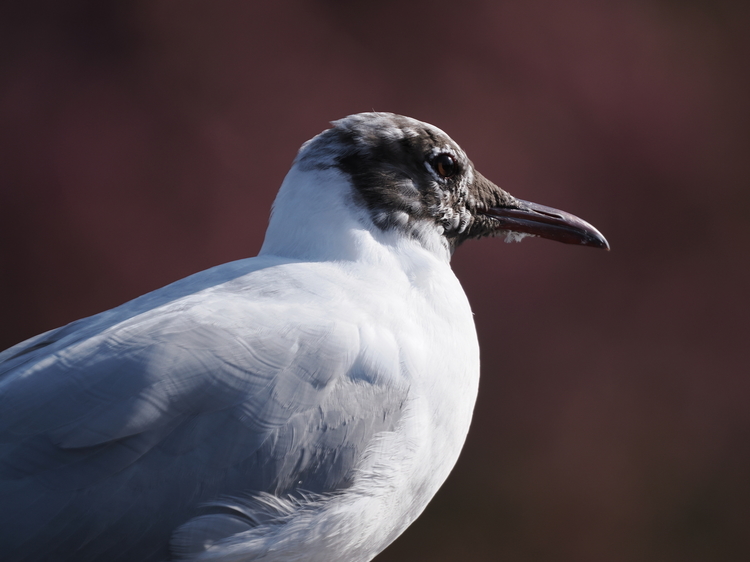 都会の公園で出会ったユリカモメの凛々しい表情を800mm相当で切り取った。画角が狭いので、少しの立ち位置・カメラ位置で背景の色合いが変わる。この場合は、鮮やかなピンクを背景に配した。斜光で明暗の大きい状況だが、各部の表現やシャープネスは良好に感じる。輪郭にも色の滲みは感じない。