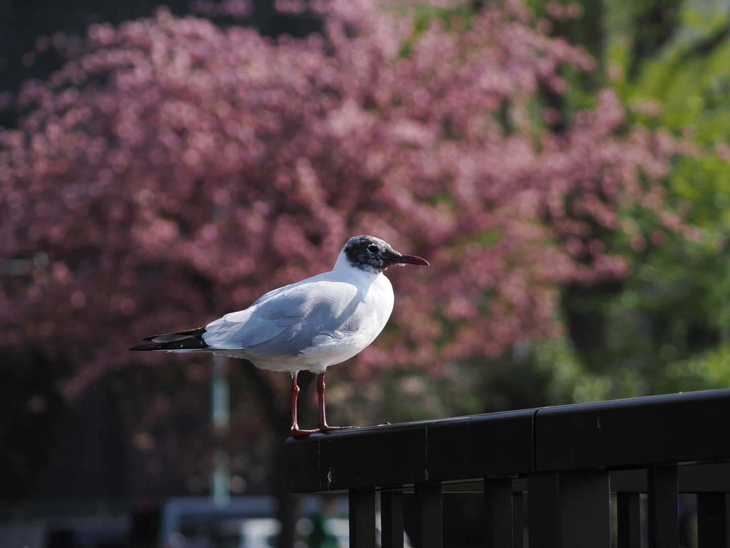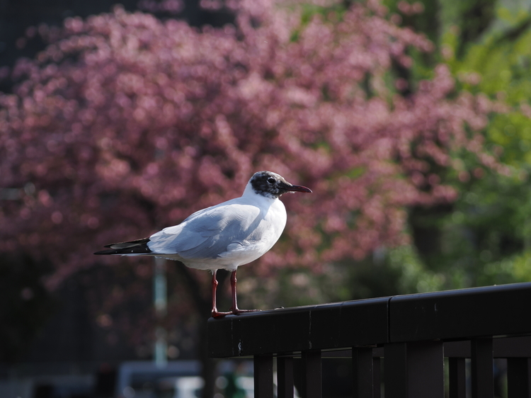 ズームを引き、200mm相当で写したカット。背景のピンクの正体がわかるだろう。ユリカモメは、冬の間は頭が白いが、春、まさに桜が咲く頃に、頭が黒くなる鳥だ。野鳥撮影では、基本的にズームを最大にした状態で使う機会が大半だと思うが、運良く近づけた時には、このようにズームを引いてやると、生息環境の情報がわかる写真になる。