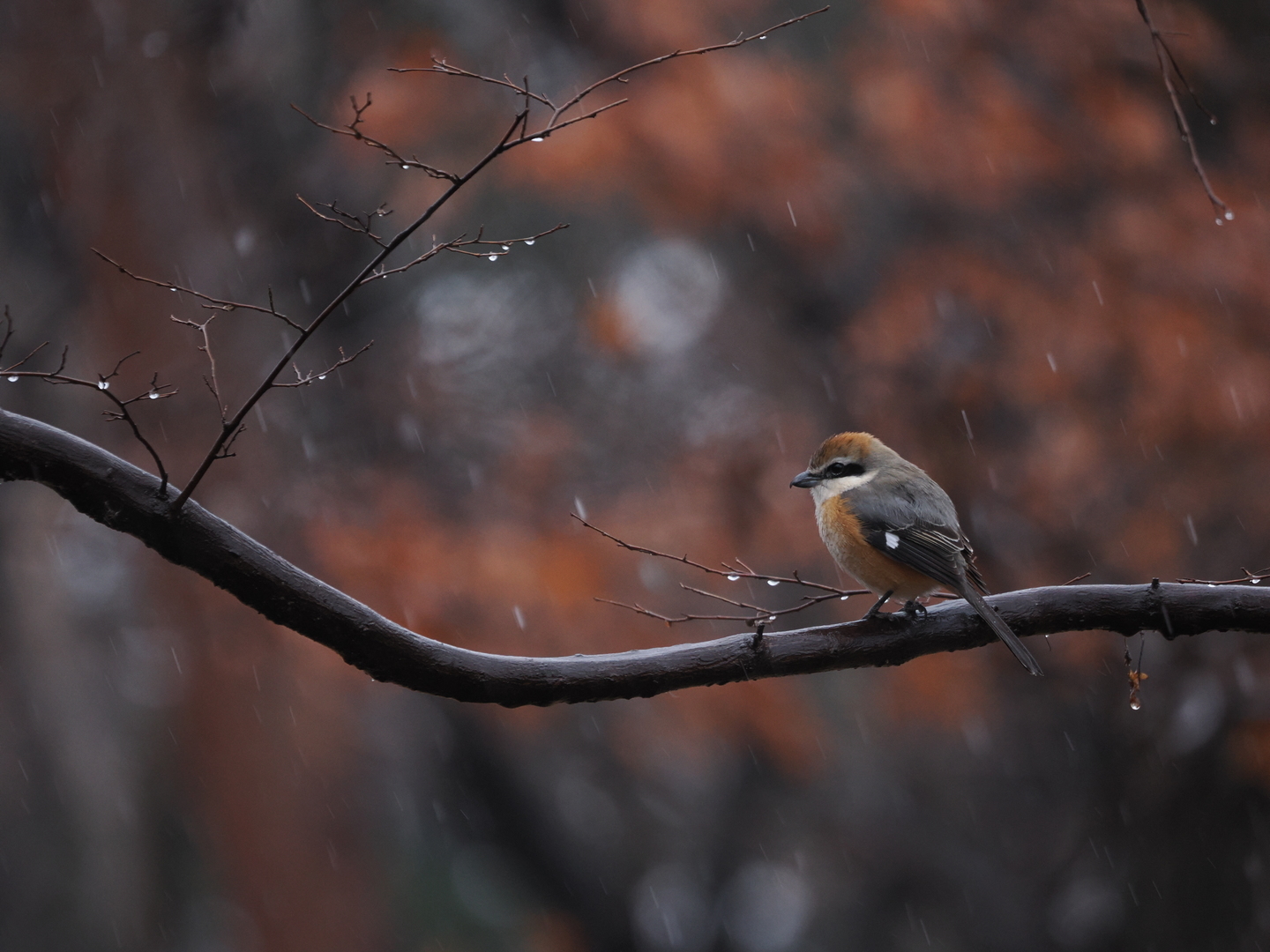写真のモズは、雨の日に訪れた都市公園で出会ったもの。普段より人が少ないのもあって、園路のすぐ脇で落ち着いて止まっていたようだった。なお、手ブレ補正は「レンズ優先」が推奨されているので、それに従った。3段分の補正効果がある。この写真では、手ブレ補正効果にはまだ余裕があるが、雨粒の写り方を鑑みて、シャッタースピードを決めている。