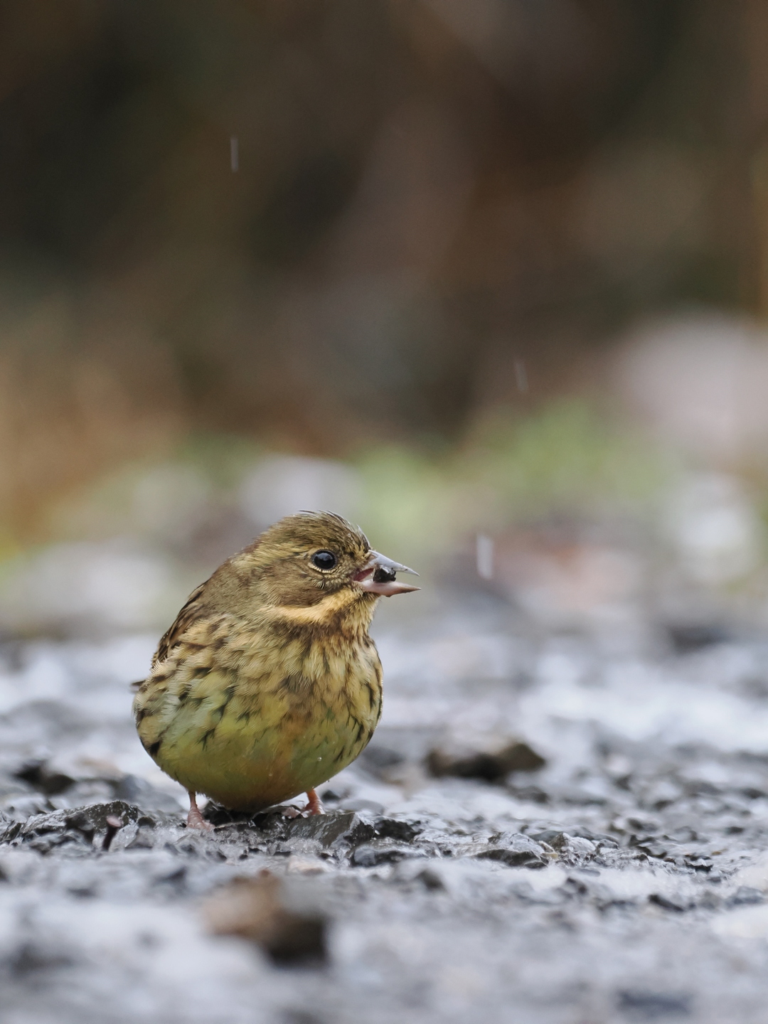 OM-1は高感度の画質が向上しているので、本レンズが活躍できる時間帯・気象条件も広くなったといえる。写真はモズと同じく、雨の降る日に撮影したアオジ。林床に届く光は乏しい状況。手ブレに関しては、レンズ内蔵手ブレ補正を頼ってシャッタースピード1/100程度まで下げても問題ないが、小刻みに動くアオジの被写体ブレを防ぐためには1/400程度のシャッター速度を確保したい状況だったため、感度を3200まで上げて撮影した。