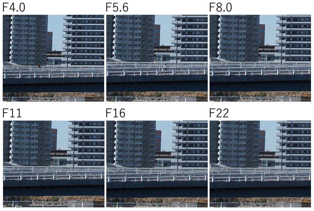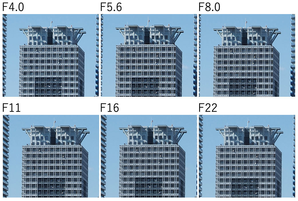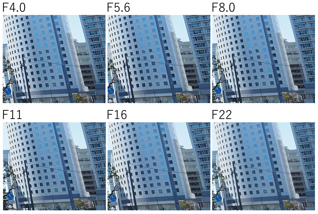 開放絞りF4.0からF5.6はビルの窓枠の細い線、奥の建物のバルコニーの手すりなどを含め極めて細かく解像している。またF8.0からF11でも高い解像力が見られる。F16で若干緩くなるがまだ十分に解像しており、最小絞り値のF22ではかなりの緩さが認められる。