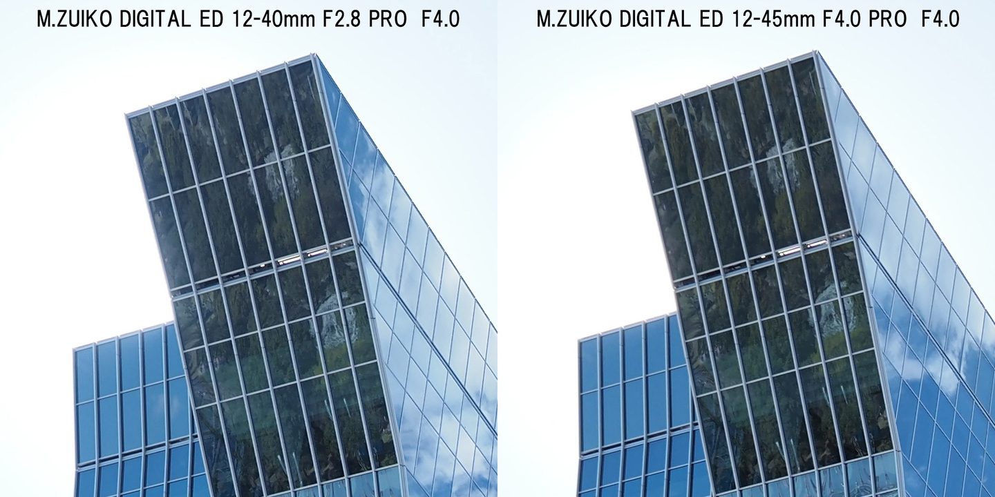 これら2本のレンズの解像力の違いを確認すべく、前項で行なった解像力テストと同様の撮影をM.ZUIKO DIGITAL ED 12-40mm F2.8 PROでも行いその結果をM.ZUIKO DIGITAL ED 12-45mm F4.0 PROと比較したところ、これら2本のレンズの解像力はほぼ同等、もしくは条件によってはM.ZUIKO DIGITAL ED 12-45mm F4.0 PROの方が上であることを確認した。