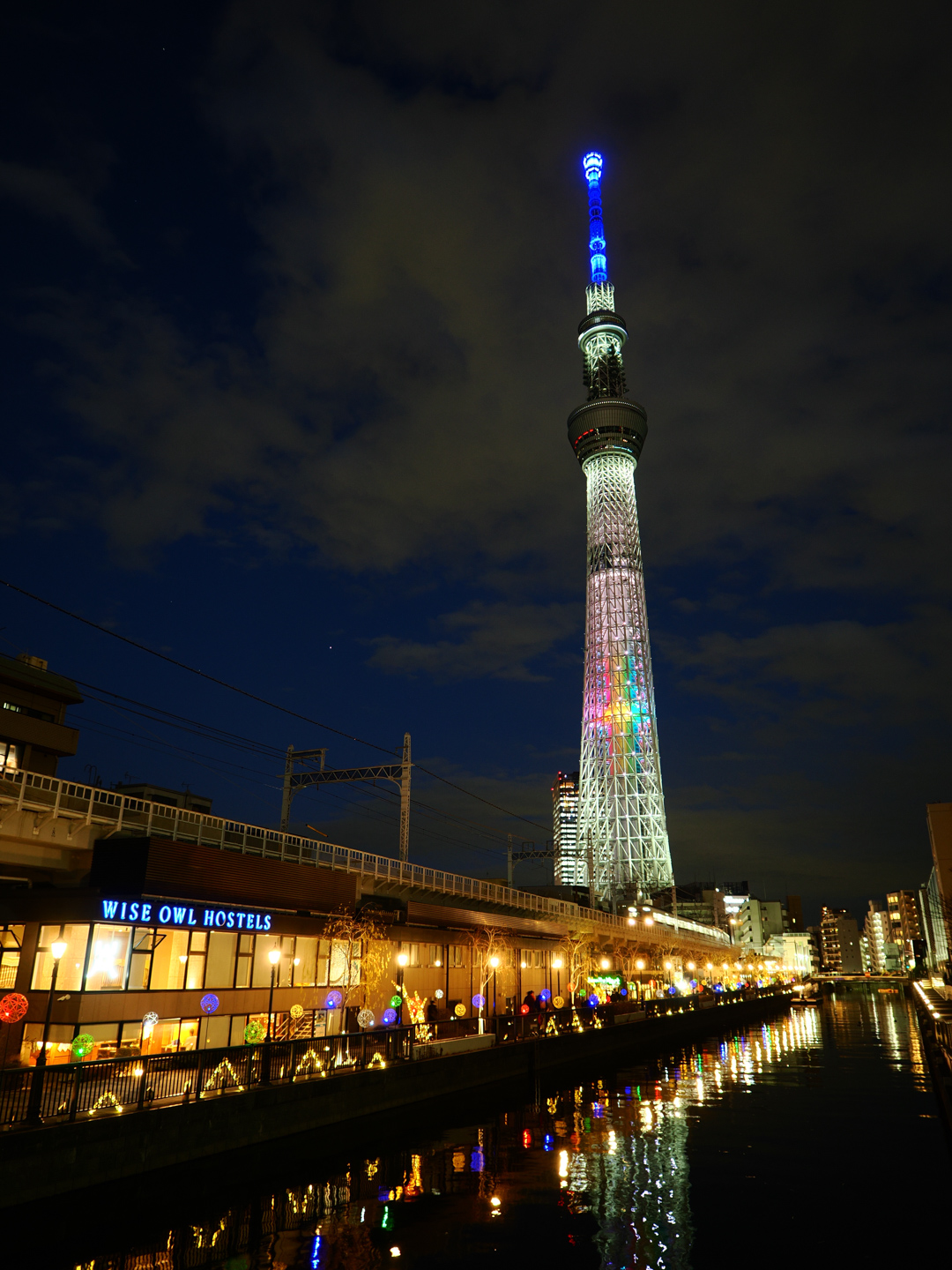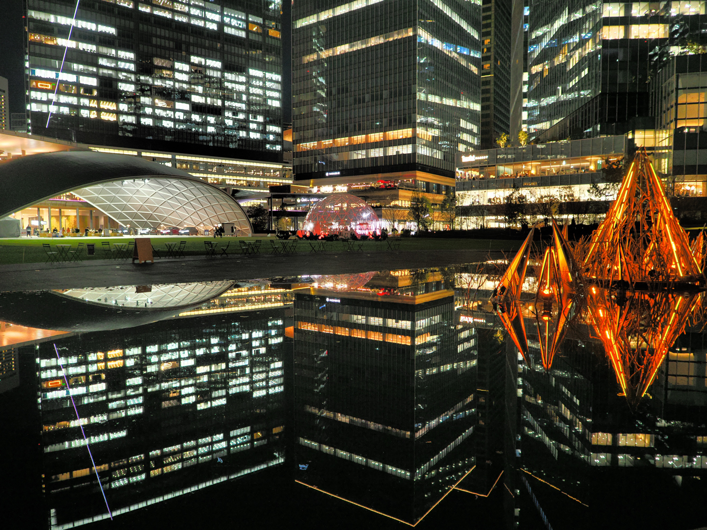 風がなく水鏡に映る夜景を手持ちで撮影。F2.0というレンズの明るさと35mm判換算24mm相当という広さが活躍してくれた場面です。