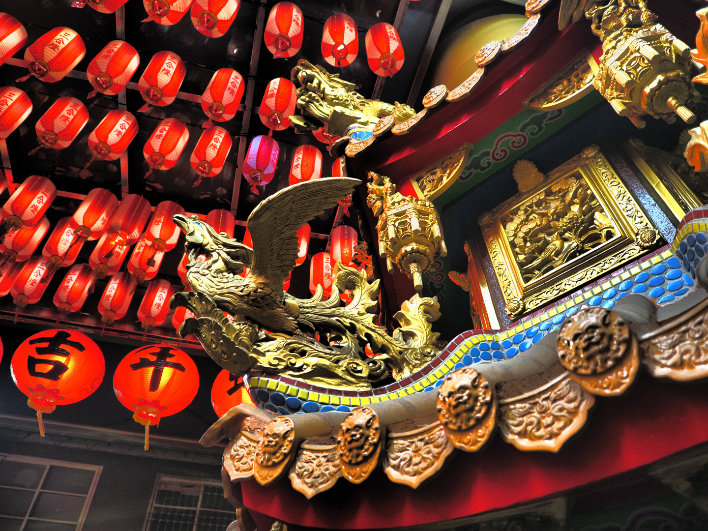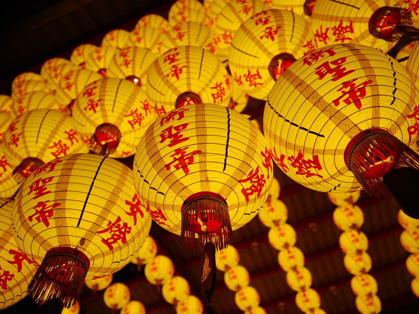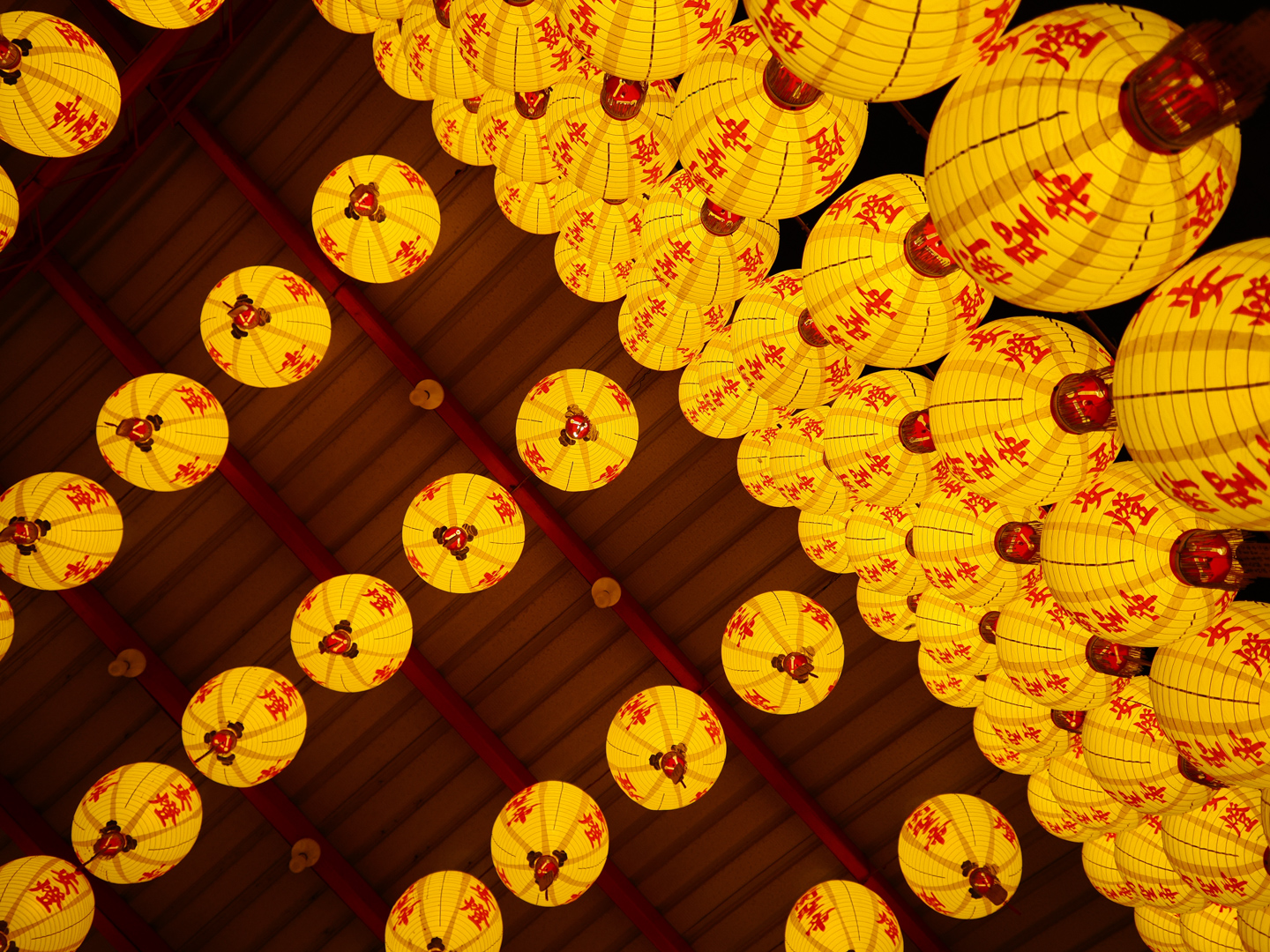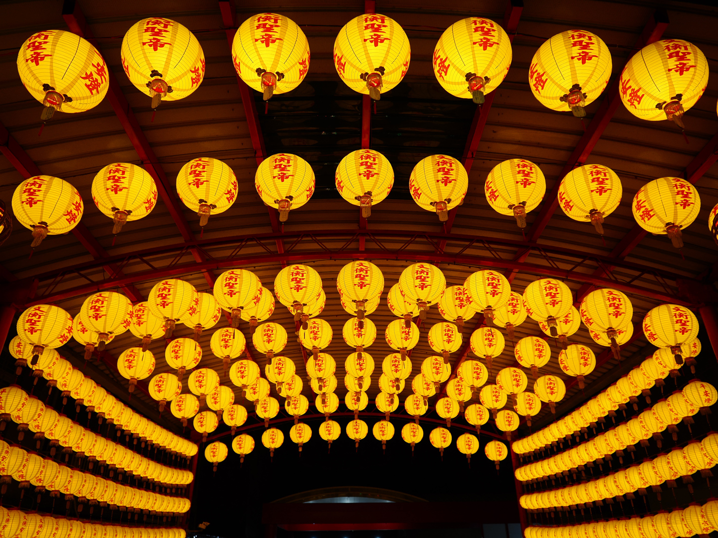 広角はまずなんといっても画角の広さが大きな特徴ですが、被写体へのアプローチの仕方によって写真の印象が変わります。台湾の寺院(廟)でずらりと並んだランタン。正面からシンプルに撮影したものと、下から見上げる角度で撮影したもの。さらに下から見上げつつ、ランタンに近寄ることで、全て同じ大きさのランタンなのに手前のものが大きく、奥のものは小さく写ることで遠近感が生まれました。同じ被写体でもアングル、アプローチによって随分と印象が変わることがわかります。