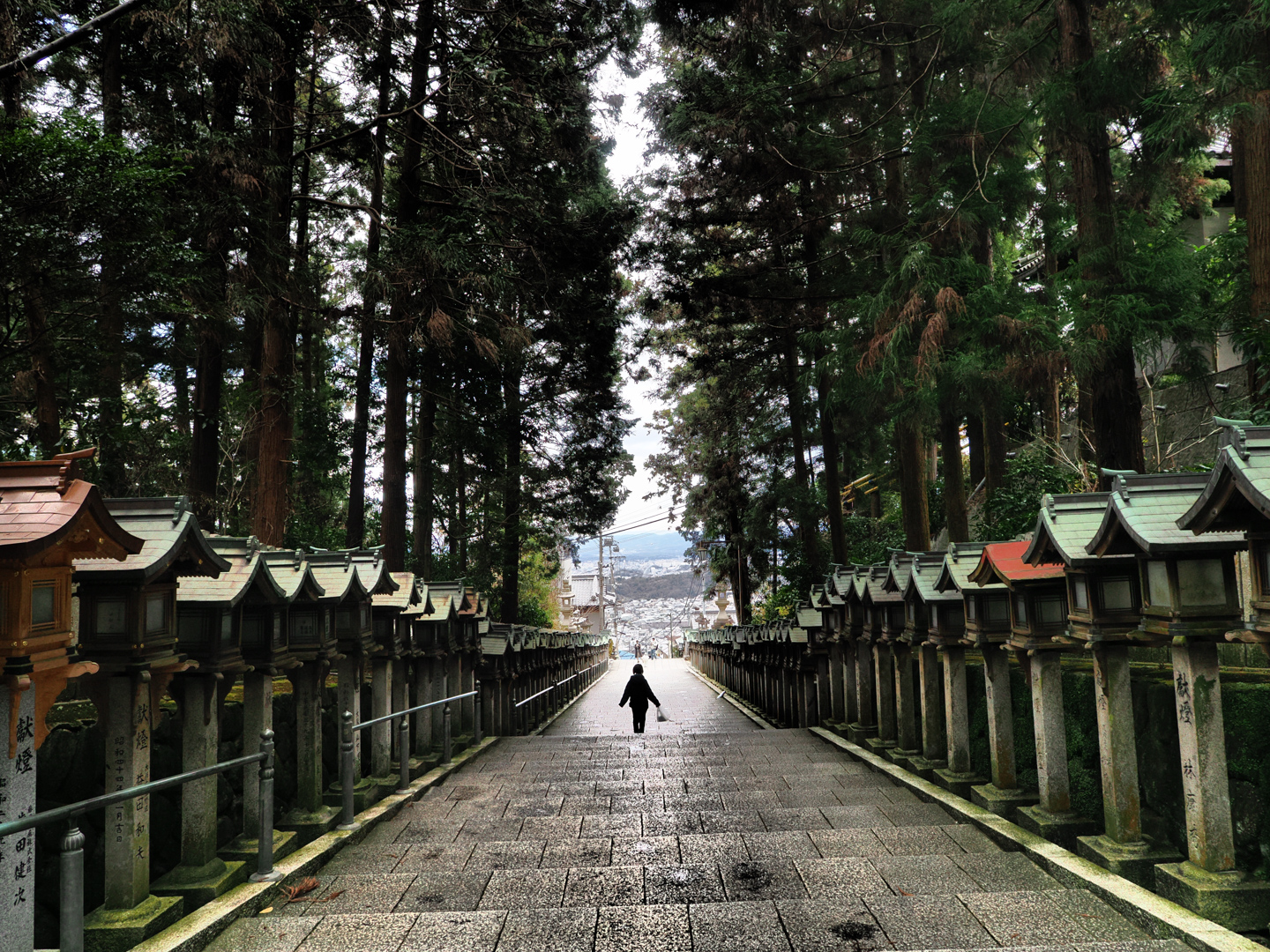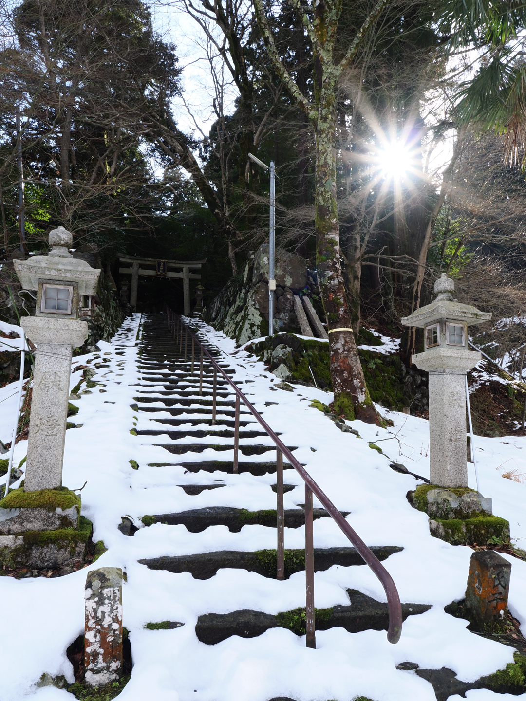 とある神社への参道を上る際に、階段を見上げると正面に太陽があったため、絞りをF11まで絞り、光条を出してみました。