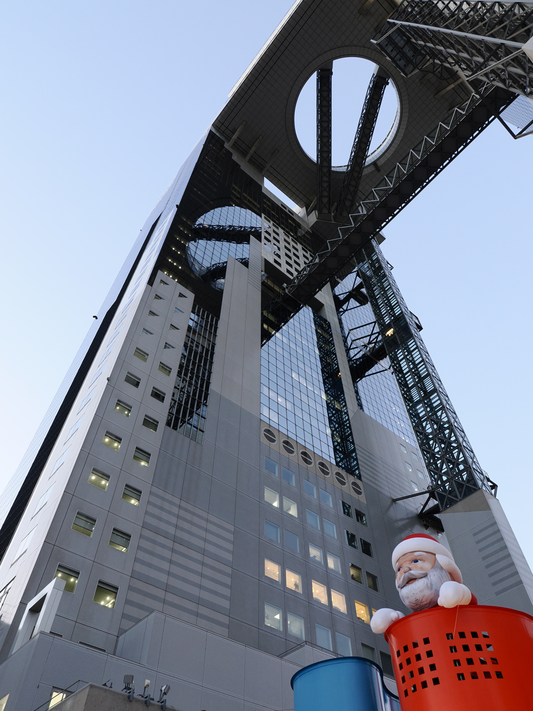 縦構図では、下層階と上層階で建物の平面積に差のないビル(高さ173m)も、近づいて見上げることで下層階が上層階よりもずいぶんと広く感じられます。広角では遠近感が強調されるとともにモノの形に歪みが生まれることも特徴のひとつです。