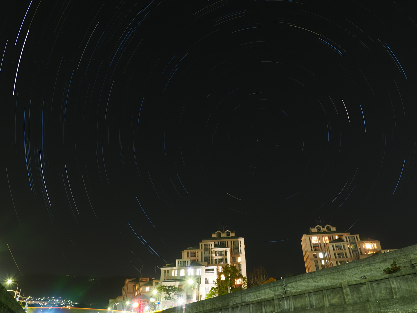 広角レンズは空を広く撮りたい星景撮影にも向いています。大自然とはあまり縁がなく、また日頃クルマに乗らない筆者は基本的に近場の都市圏での撮影となってしまいます。ここで有難いのがOM SYSTEM機に搭載されている、夜景と星の両方を一度に撮ることのできるライブコンポジット機能。今回は終電を気にせず撮れる自宅近くで撮影してみましたが、北極星よりもかなり高い位置の星まで捉えることができました。(この時間、飛行機が通らなかったことが幸運でした!)