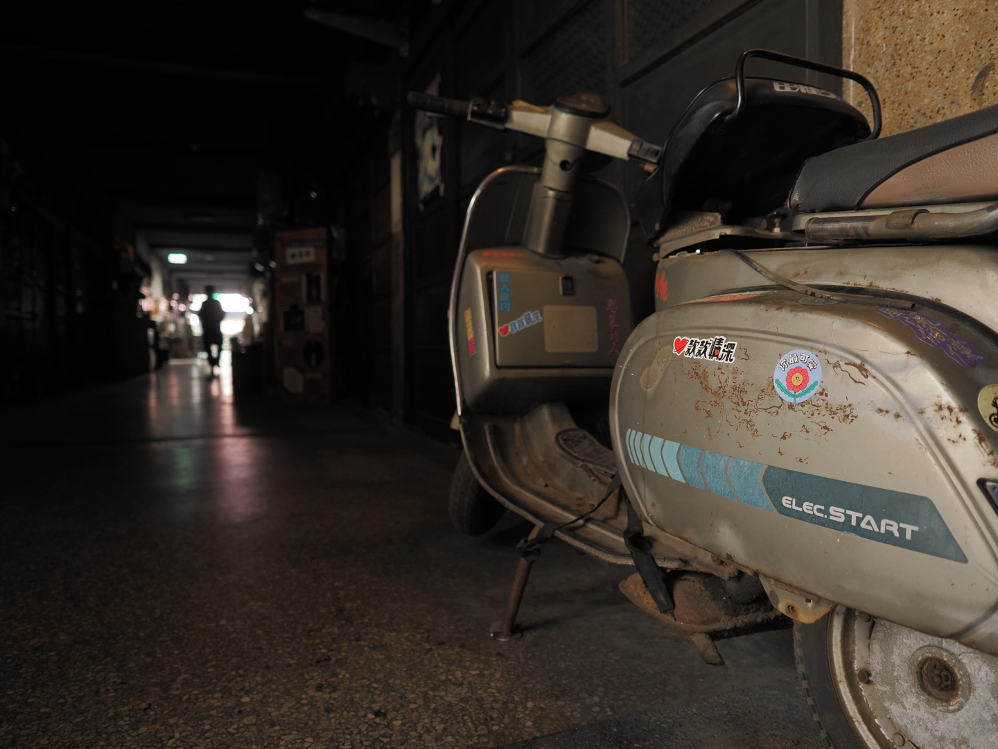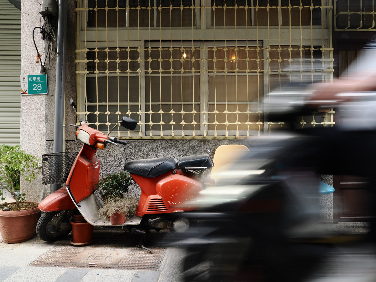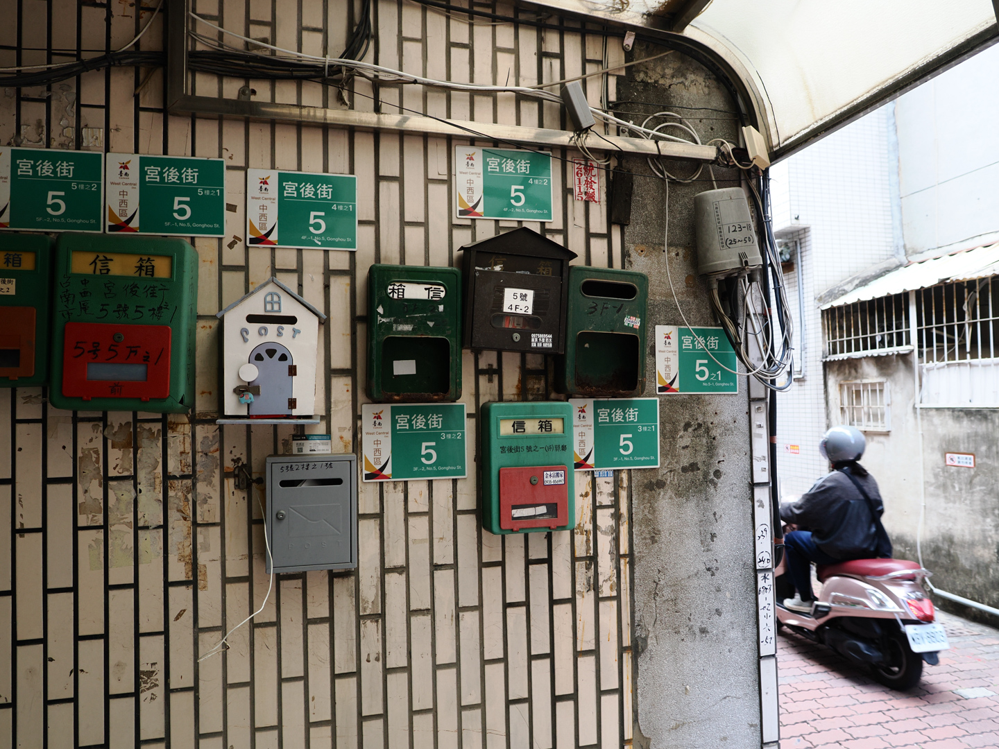 広角でのスナップでは、撮りたい被写体に「プラス1(ワン)」がポイントになってきます。台湾らしい、統一性があるようでない郵便受けが並んだ壁面に惹かれたものの、あとちょっと何かないかな……というところで、そばの路地をこれまた台湾らしいともいえるスクーターが通ることに気付き、タイミングを待って撮影しました。