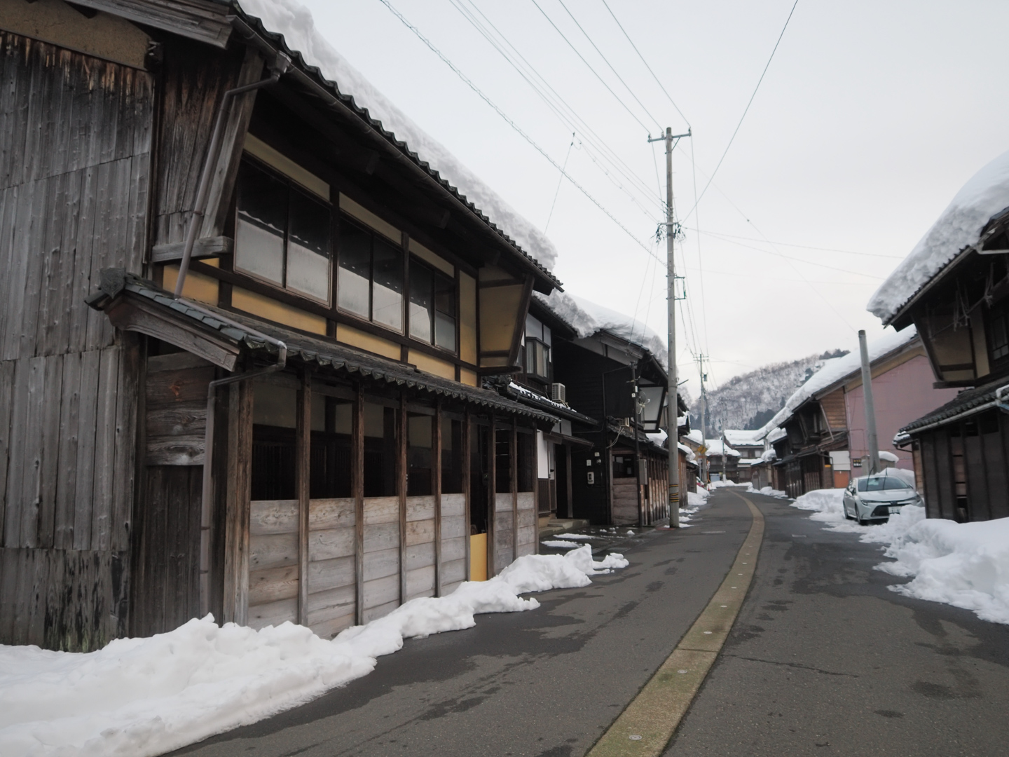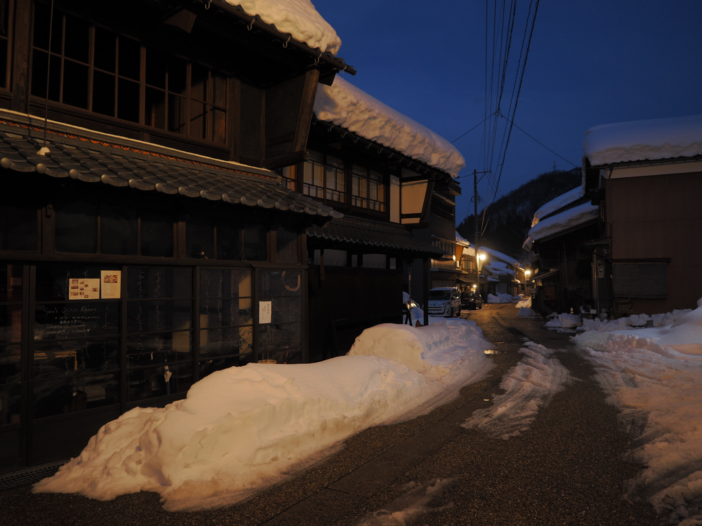 寒波到来後の旧宿場町は、豪雪地帯とあってかなりの積雪があり、日中から夜にかけてスナップして歩きました。ただでさえ雪で道路幅が狭くなっている上に案外交通量もあり、三脚は使えそうにない中でも明るいレンズだと安心して手持ち撮影ができます。それにしても除雪のありがたさを実感した日でした。
