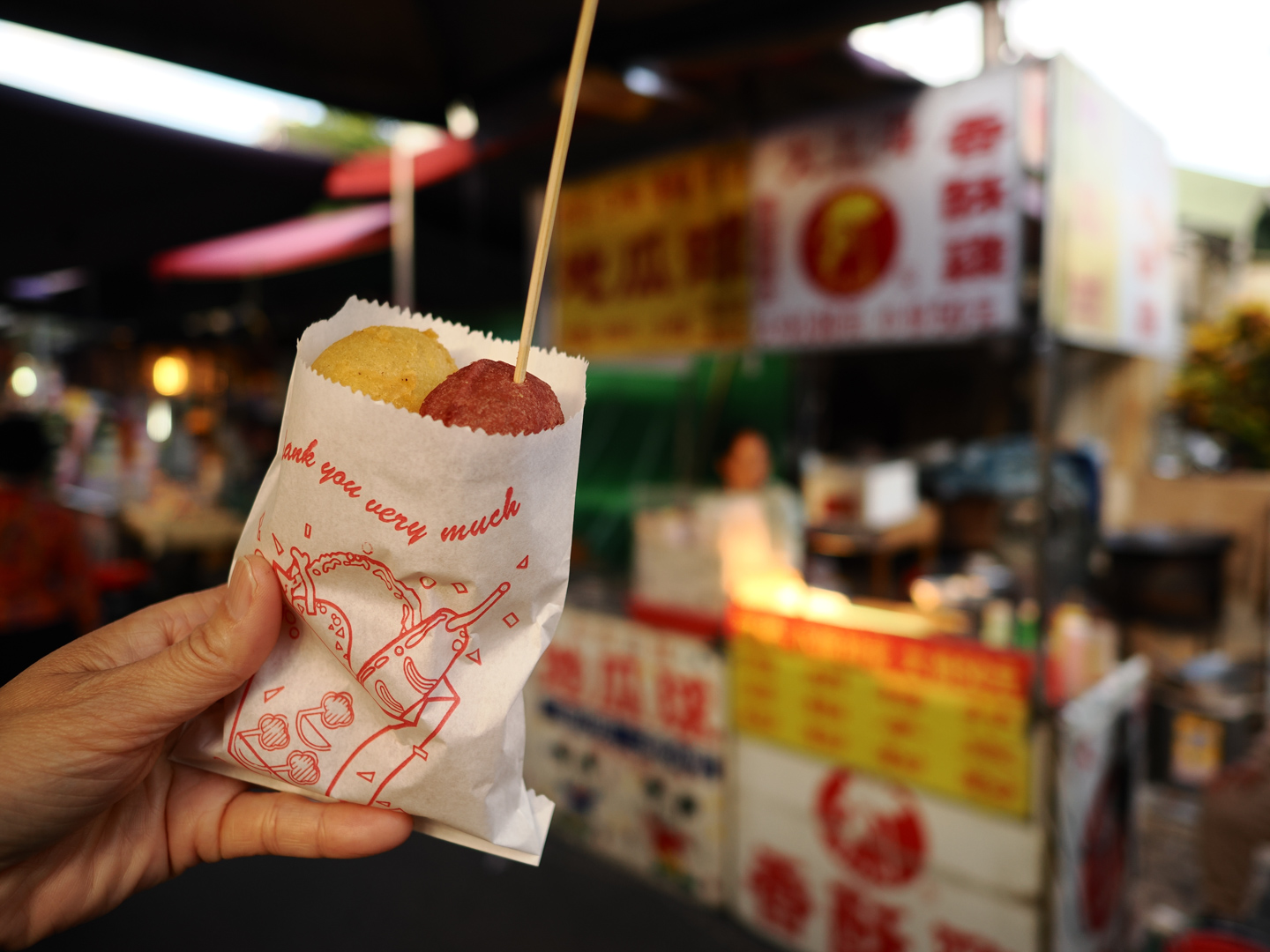 台湾の人気おやつ、さつまいもボールを購入。画角が広いと背景も広く入るため、購入した屋台を背景に入れつつ、夕方で薄暗くなりかけていたこともあり絞りは開放で撮影。最短撮影距離が0.2mと近いことから手に持った被写体でもしっかりピントを合わせることができます。レンズの特性として、同じF値でも広角の方がボケにくいことから、F2.0でも背景の雰囲気や大まかなディテールがわかる1枚となりました。