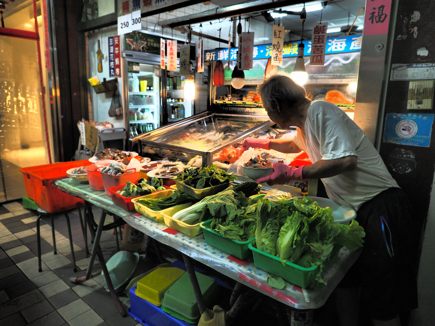 夜の台南をスナップして歩く中での1枚。飲食店の店頭でオーダーののちに店先の歩道に設置された客席でいただくシステムゆえ、まるで店内を横切るような形で歩道を歩く途中でパチリ。仕上がりにアートフィルターのドラマチックトーンを選ぶことで暗部が持ち上げられて隅々まで描写することができました。