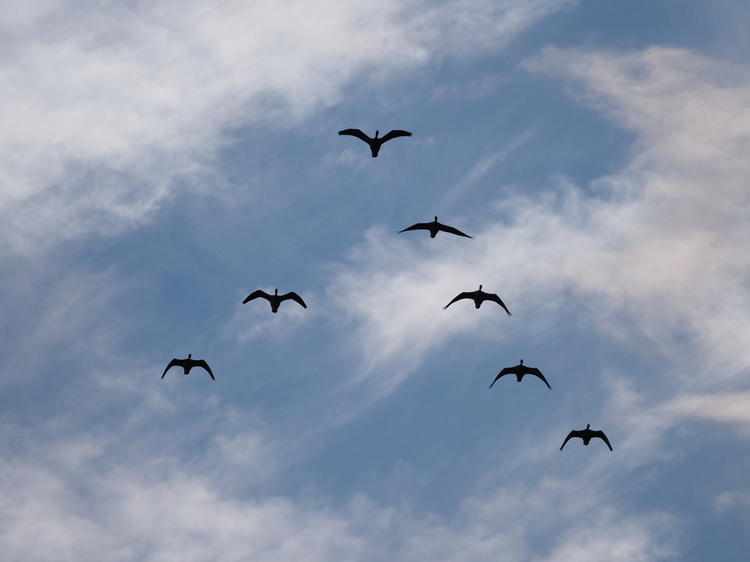 ズームを引くと300mm相当になる。この焦点域は、運良く野鳥に近づけた時、ズームを引いて背景に生息環境を取り入れるのに使うことが多い。また、ハクチョウ類やガン類のように、大型の鳥や、群れで飛ぶ鳥をバランスよく写すのにも便利だ。作例は、湖から飛び立ったマガンの群れが、旋回してこちらに向かってきた場面。ズームを引くことで、編隊を組んで飛ぶ様子を表現できたのだが、それをファインダーを覗いた姿勢のままに完結できることがありがたかった。