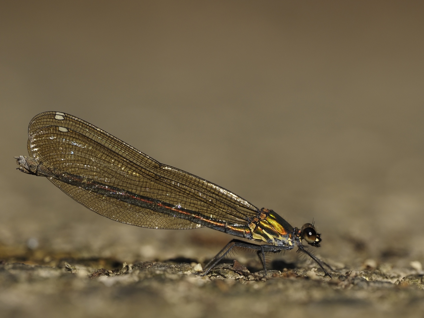 作例は、探鳥中にふと見た足元に静止していたニホンカワトンボ。そのまましゃがみこみ、1.3mの最短撮影距離付近で撮影した。解像度も色再現も秀逸で、ニホンカワトンボのディテールが最大限に描写されている。