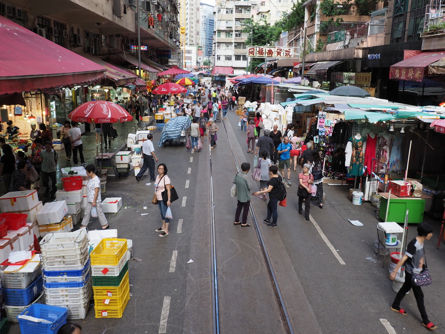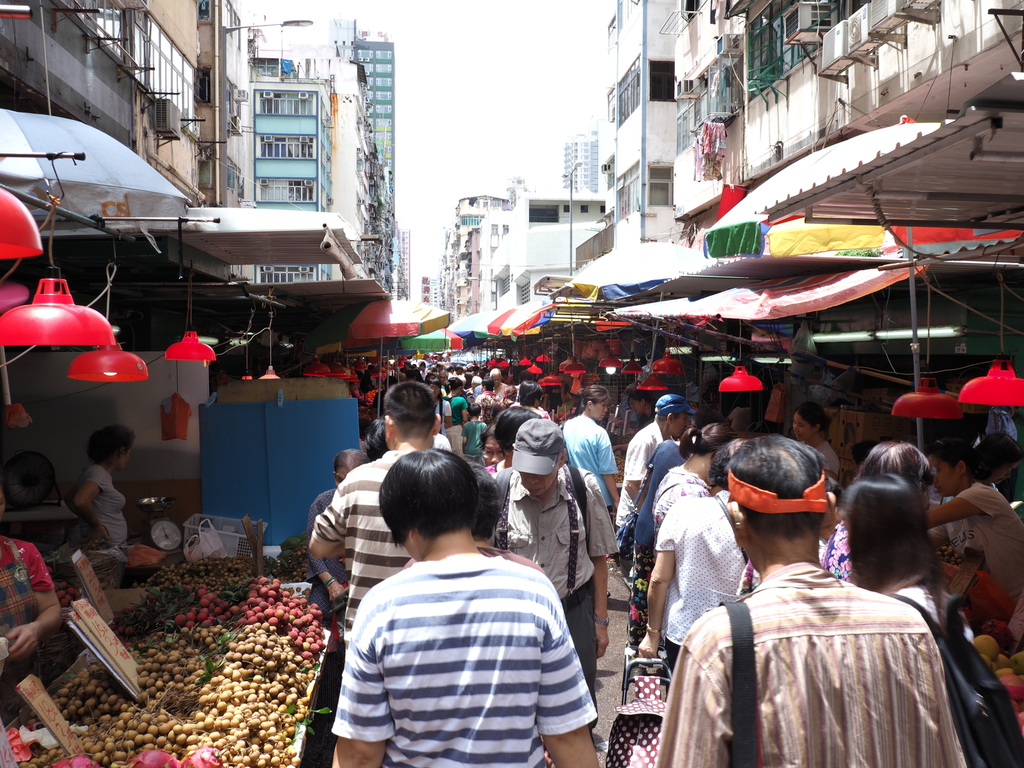 一方で市場の雑踏に身を置いて水平方向に撮影すると、狭い路地にずらりと並んだ露天の奥行きは表現しつつ、人いきれの感じられる雑踏の様子もしっかり伝わってきます。こんな「密」な光景でも安心して撮影できたことが今となっては懐かしいものです。