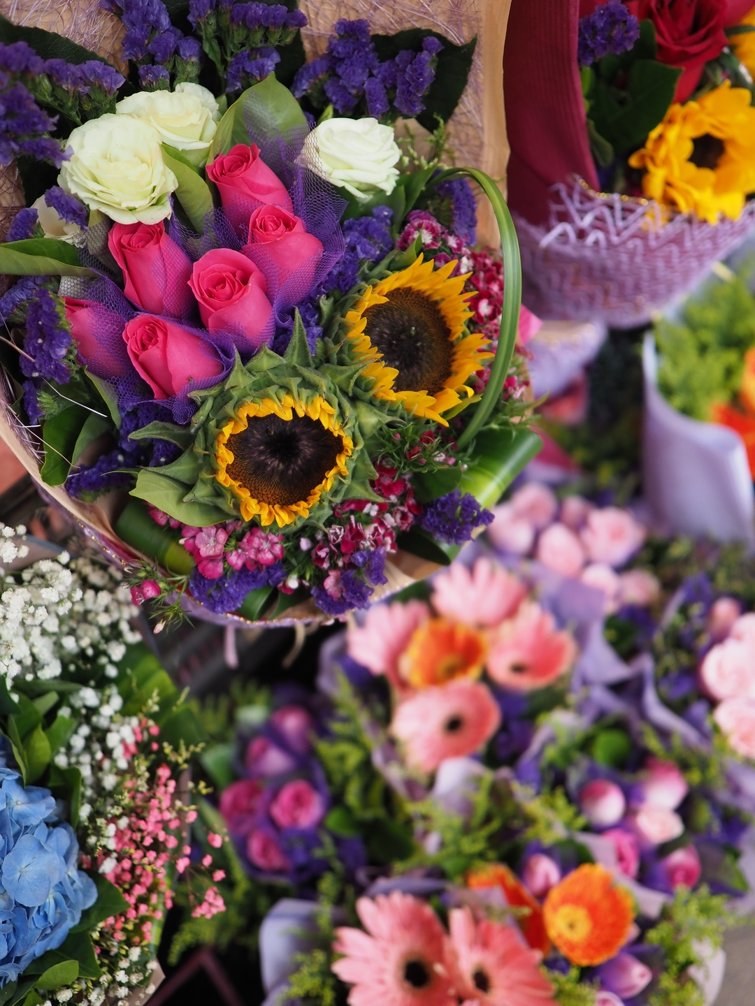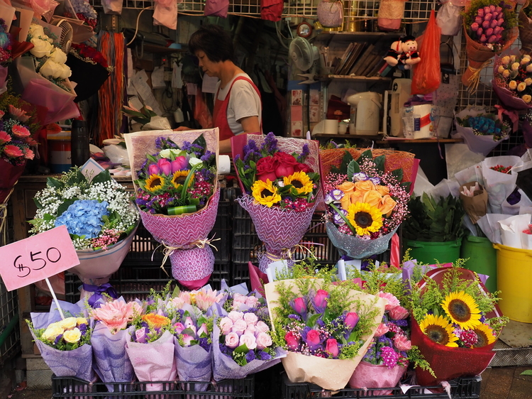 花屋さんばかりが集まった花墟道(フラワーマーケット)で、店先の女性に声を掛けて撮らせてもらいました(でも彼女自身はあまり写りたくないらしく、そっぽを向いてしまった……!)。少し引いて店先全体を入れつつ、日本のものとは少し見せ方の違う造りの花束をクローズアップ。街中でのスナップでも、このように寄りと引きの両方を1本のレンズで手軽に楽しむことのできるレンズです。