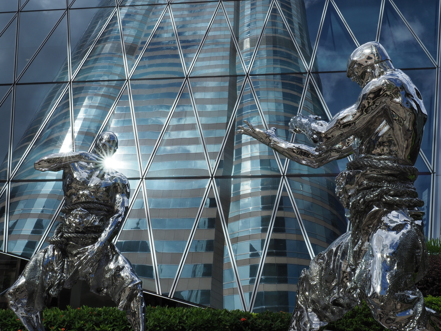 真昼間の逆光など、画面の中に強い光がしっかり入ってしまうような場合、絞りをしっかり絞ってカッコイイ光条を出したくなってしまいます。今回は街の中心部にある「Above the clouds」というタイトルの、雲の上でふたりが闘っている姿の彫刻の背後、ビルのガラスに強い太陽光が当たっていたため、この光を片方の人物に持たせて、まるで光の球を投げようとしているかのように見立ててみました。しっかりとした光条を出すことで、何だかより強そうに感じられませんか。