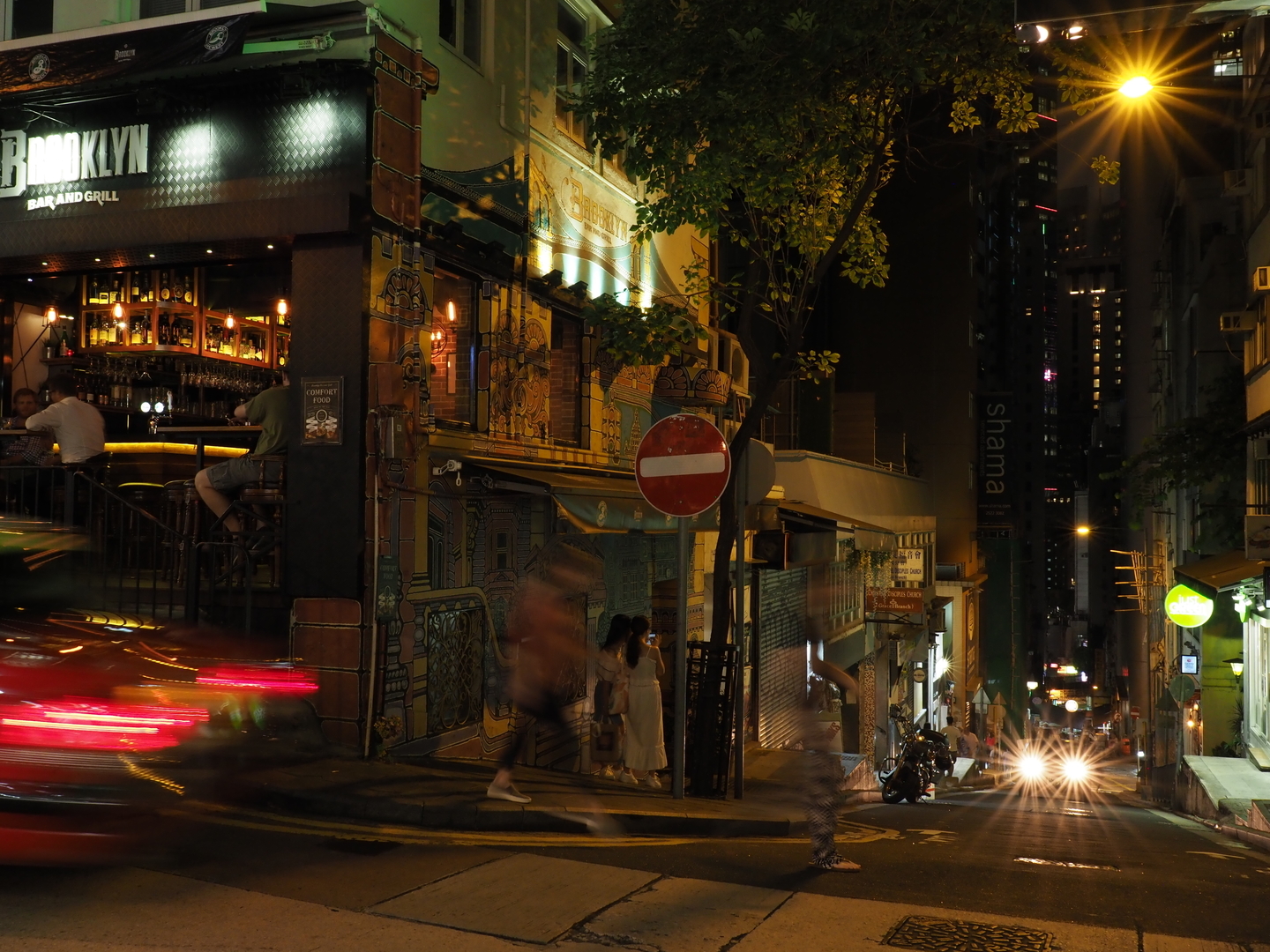 また夜の街角で、スローシャッターで車や歩行者をブラして撮影したのですが、この時もF8まで絞ると街灯や車のヘッドライトにこのような綺麗な光条ができました。光の筋を数えてみると、その数は18本。このことから、このレンズの絞り羽根が9枚であることがわかります。尚、絞り羽根の枚数が偶数の場合は羽根の枚数と同じ数、奇数の場合はその倍の数の光条ができます。