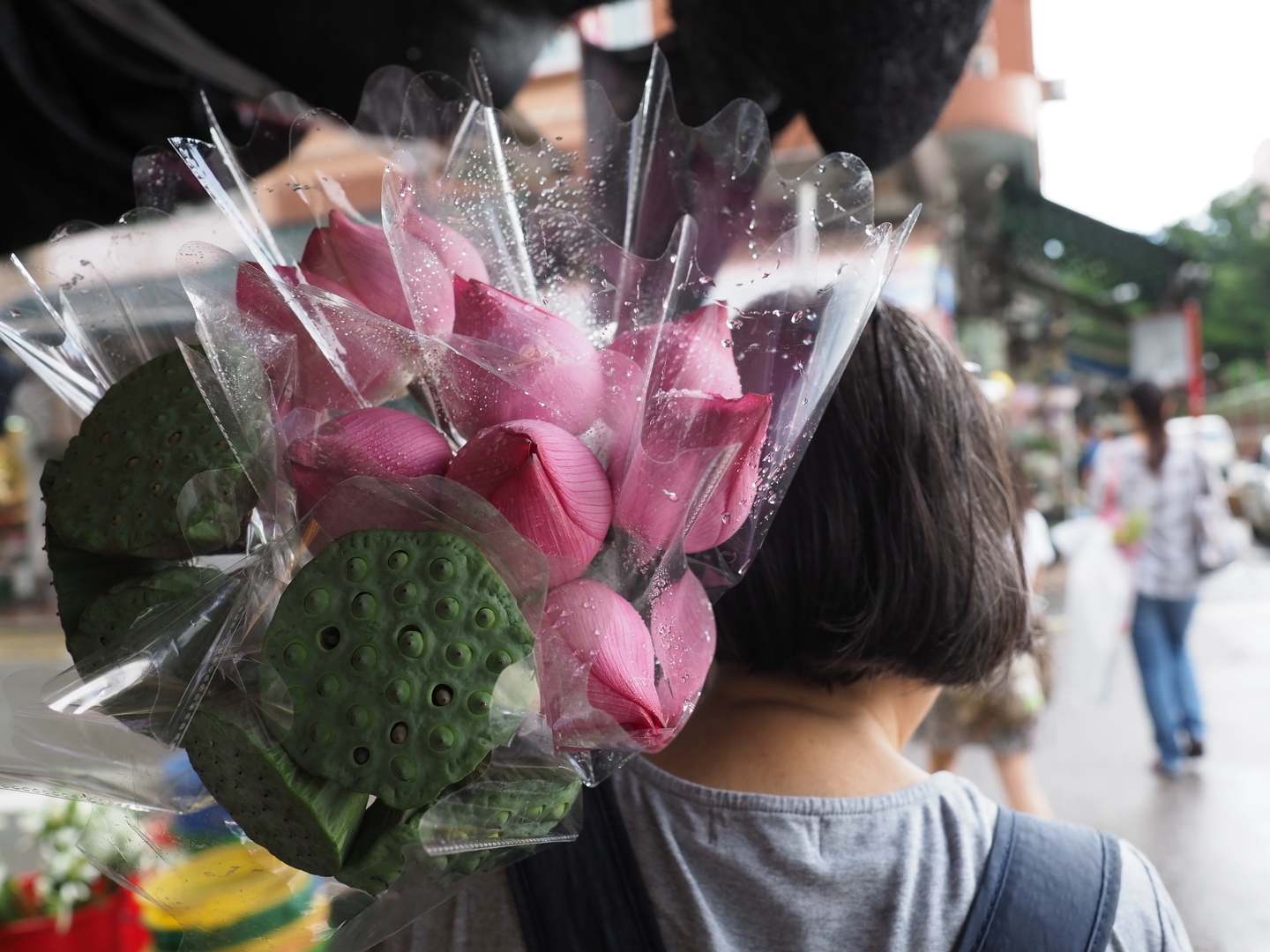 雨季となる夏の香港において、この時は概ね晴れる日が多かったものの、ある日街を歩いていると、突然空が暗くなって雷まで鳴り出し……文字通りスコールがやってきました。ちょうどフラワーマーケットの近くだったので、雨に濡れたお花をパチリ。さらに雨が上がってすぐのタイミングで、大きな蓮の花を抱えた女性とすれ違い、咄嗟にパチリ。