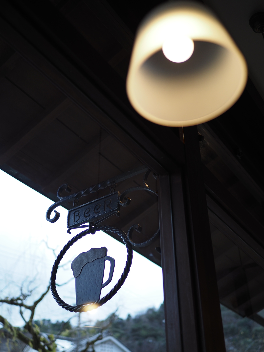 窓際の席から軒先の看板を見上げると、店内側は輝度差により暗くなりますが、そこに吊るされた灯りがとろりとやわらかくボケながら加わりました。このボケ味をおつまみにビールが飲めてしまいそうなのは私だけでしょうか。