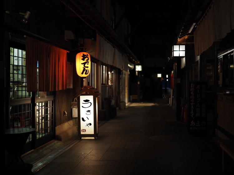 外湯めぐりが有名な城崎(きのさき)温泉に夜の帷が下りた頃。歩くには不自由ない明るさですが、一般的な一眼カメラ用のレンズでは手ブレや被写体ブレが心配です。そこでISO感度をかなり上げることになるのですが、このレンズは絞りをF1.4まで開くことができるので、ISO800でもシャッター速度は1/100秒で撮影することができました。