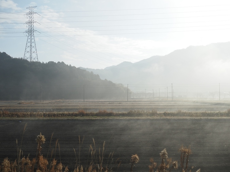 今回、特急「こうのとり」で福知山線から山陰本線を北上したのですが、途中、篠山付近で朝靄の立ち込める風景が広がりました。このあたりは霧の発生しやすい地形なのですが、うまい具合に陽が差してとても幻想的な光景となりました。