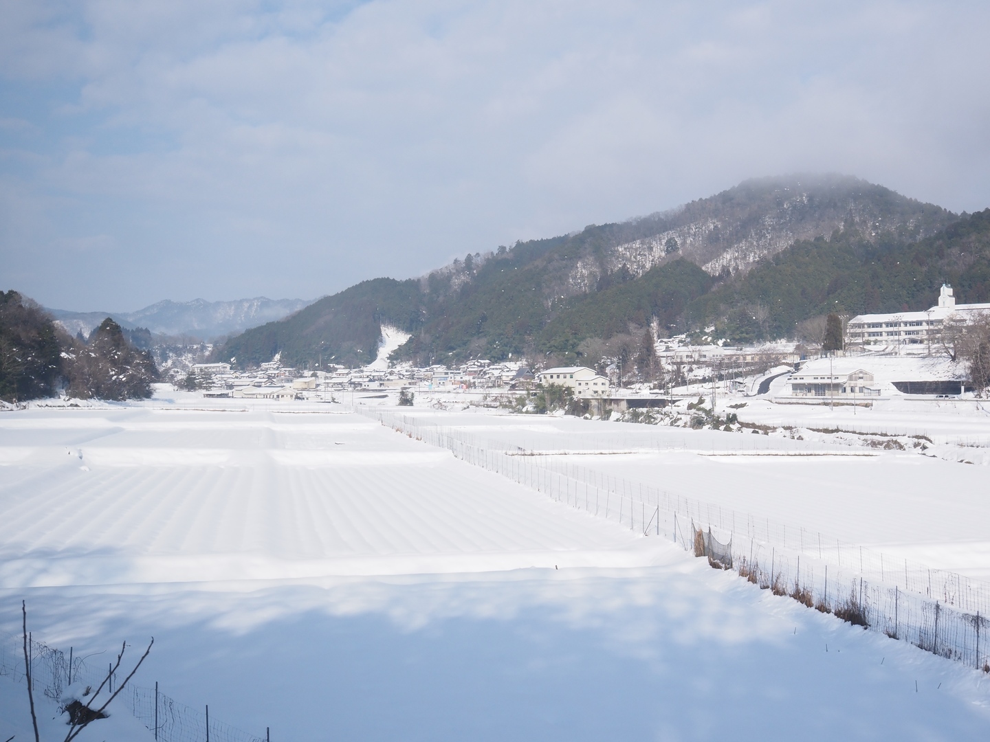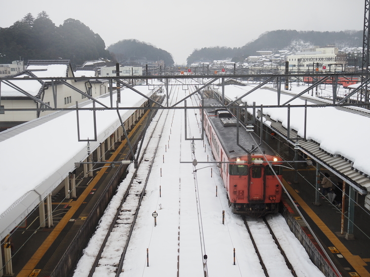 山陰本線と合流する京都府の福知山を越えると一気に雪景色に。電車の窓ガラスは緑が被りやすく色が合いにくいためあとで調整をしてはいますが、ガラス越しでもしっかりクリアな画像を得ることができました。
