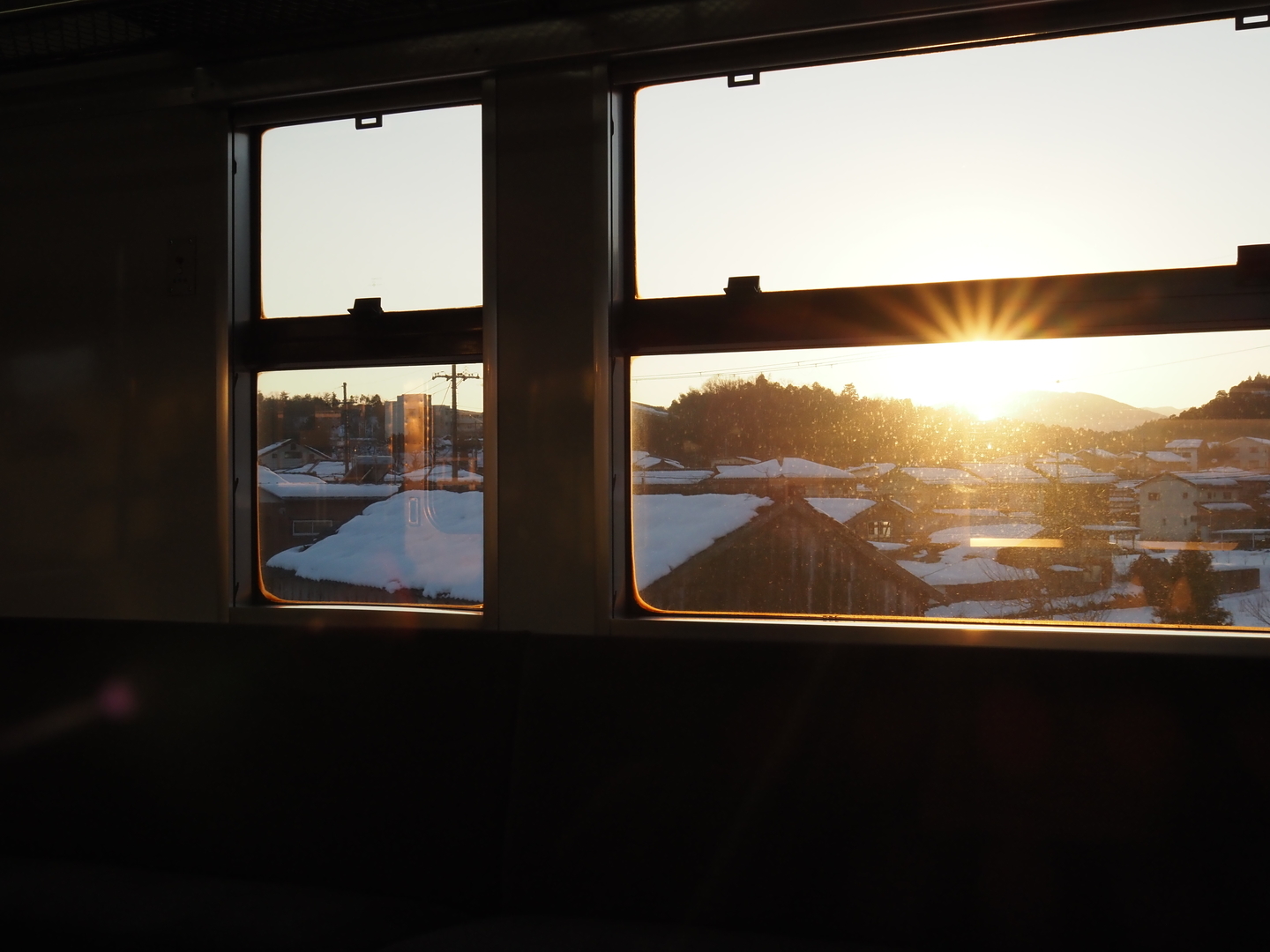 城崎温泉から宿を取った豊岡まで、レトロな車両の普通列車で移動。ちょうど夕陽が差し込む時間だったので、敢えて向かい側の座席と窓越しに撮影。絞りはF8で、少しゴーストは出たもののやわらかい光条が出ました。
