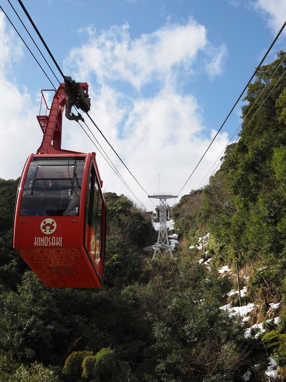 ロープウェイで見晴らしの良い山の上へ。中間駅での撮影ですが、手前のゴンドラから山上駅までの奥行き感も十分に伝わる1枚になりました。そして山上からは眼下の温泉街と円山川、その向こうに連なる山越しに日本海までが見渡せるのですが、奥行きのある光景ゆえに縦で撮影。風景にも十分使える画角です。