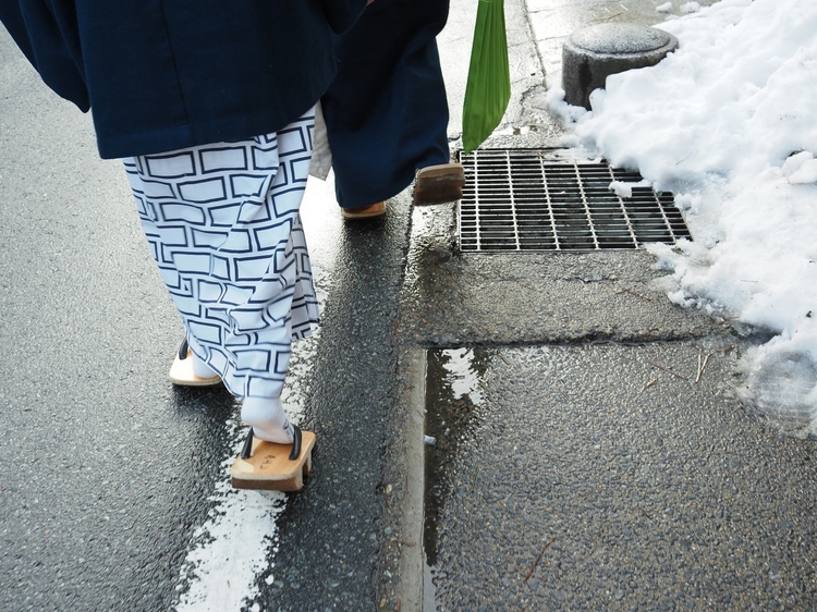 城崎温泉は外湯めぐりが大きな特徴のひとつ。旅館の浴衣を着て歩くカップルの足元を咄嗟に撮影、道の端に避けられた雪がいい塩梅に画角に収まりました。