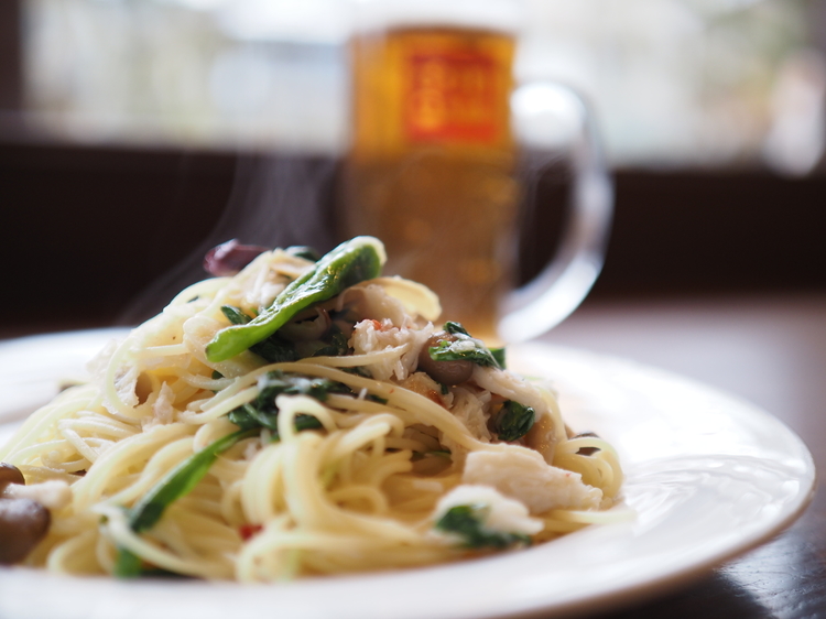 冬の日本海側に来たからにはカニ……ですが、実は姿カタチからしてあまり得意ではなく。ほぐされた身を使ったカニのペペロンチーノが精いっぱいでしたが、とっても美味しくいただきました。出来立てすぐの湯気が、とろりとボケながらもふわりと立ちのぼる様子が外の寒さを忘れさせてくれます。