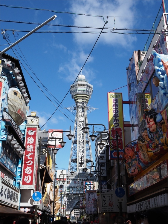 大阪・新世界にて、久しぶりに通天閣に上りました。名物だった大きなフグがいなくなり、ぽっかり空いた空間越しに見える通天閣を、程よい遠近感で捉えてくれています。大きなフグを吊るしていた竿だけが残る光景がちょっぴり淋しいものです。