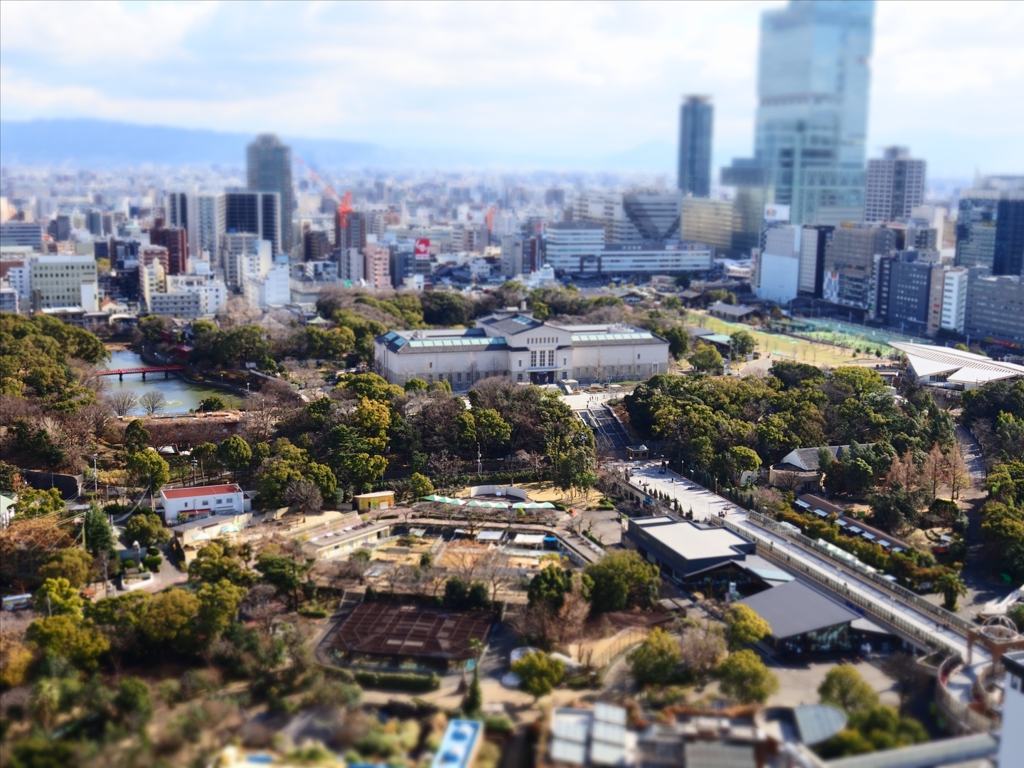 通天閣の展望デッキからの光景をアートフィルターのジオラマモードで撮影。眼下に広がる天王寺動物園からあべのハルカス、遠くに見える生駒山脈までをしっかり画角に収めつつ、ジオラマモードゆえの箱庭のような雰囲気はちょうど良いスケール感で写すことができています。